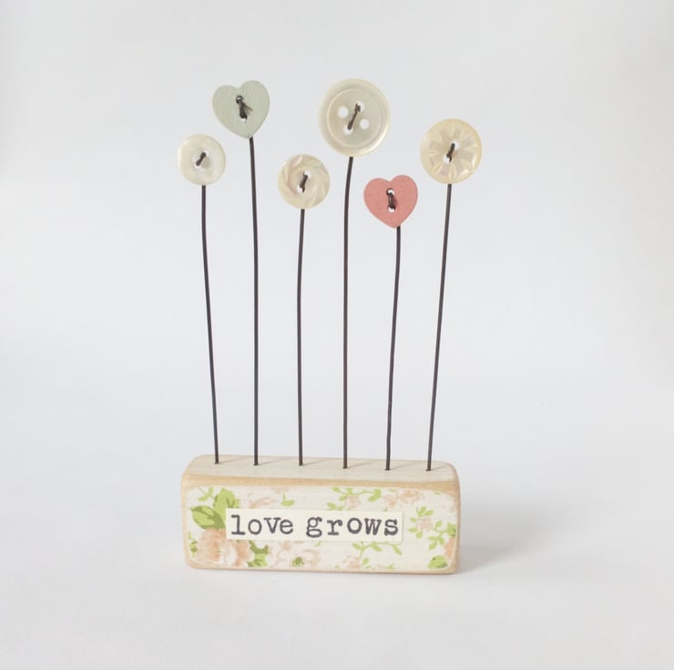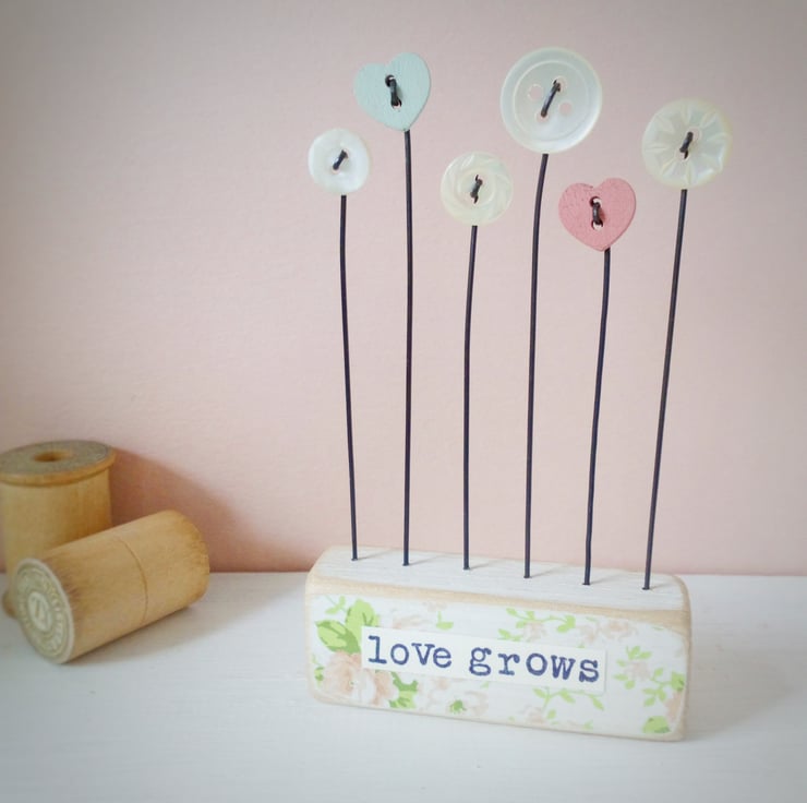 Button flowers grow in this garden, standing on their wire stalks in a painted wooden block with a decoupaged floral front.