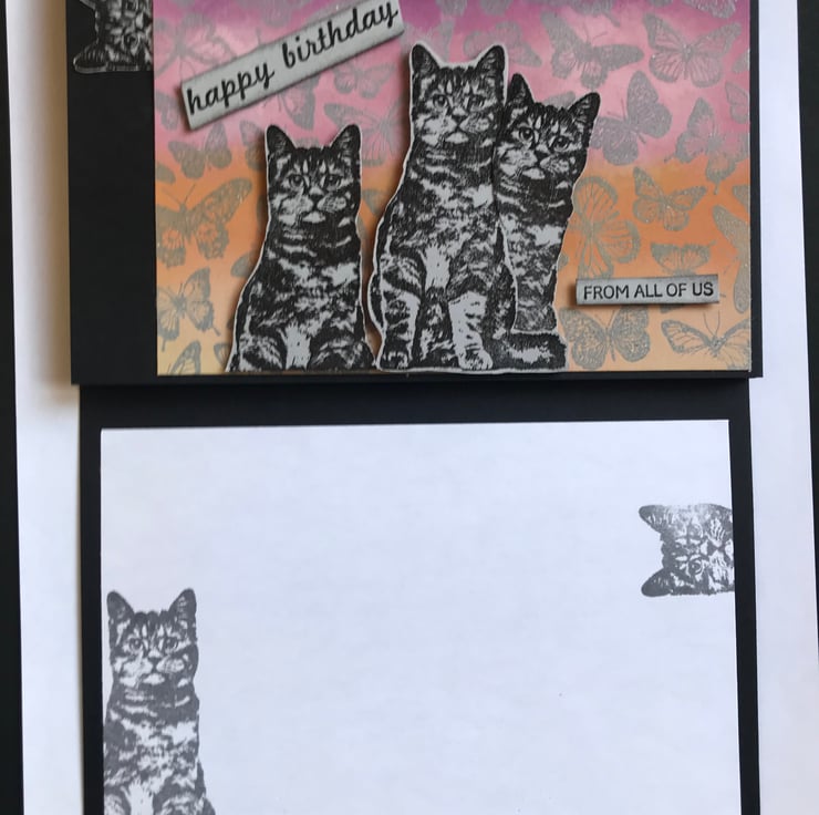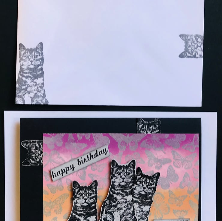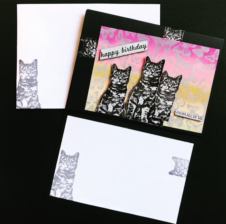 Both the card interior and the envelope have two cats stamped in grey archival ink