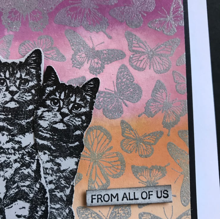 The cats, have been stamped in black archival ink, embossed and fussy-cut and added onto the card in a variety of ‘poses’ including two peeking from the top and side.