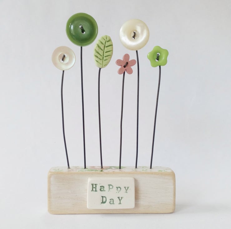 The little hand stamped clay sign on the front has the word 'Happy Day'.