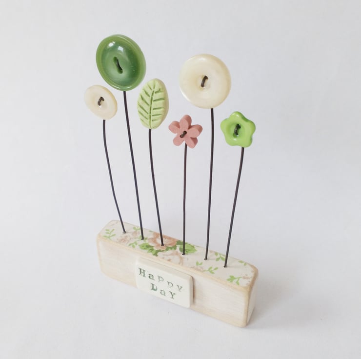 Five little button flowers grow in this garden with a clay leaf in a painted wooden block with a decoupaged floral top.