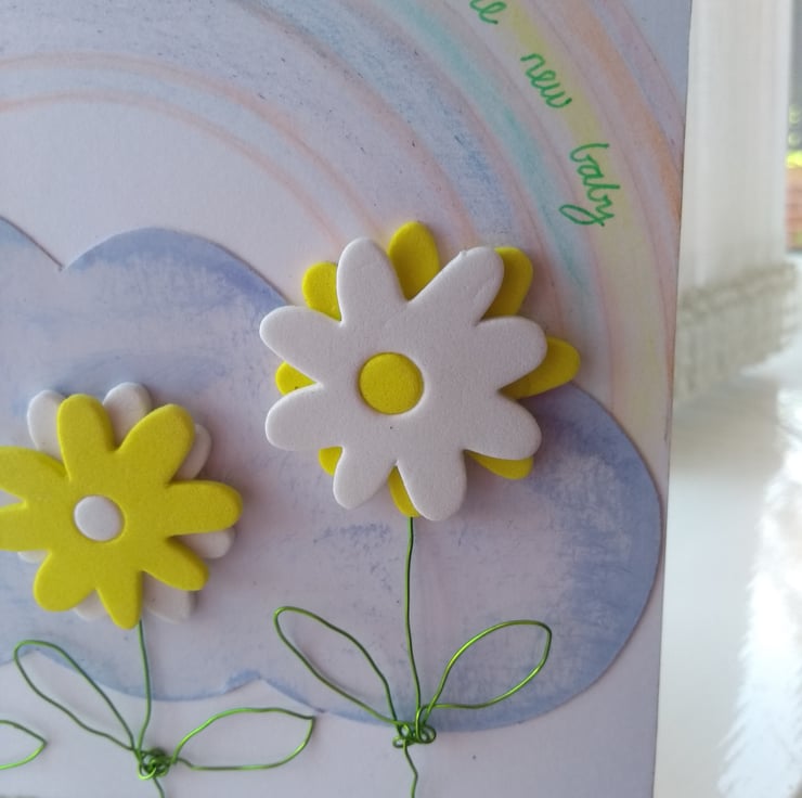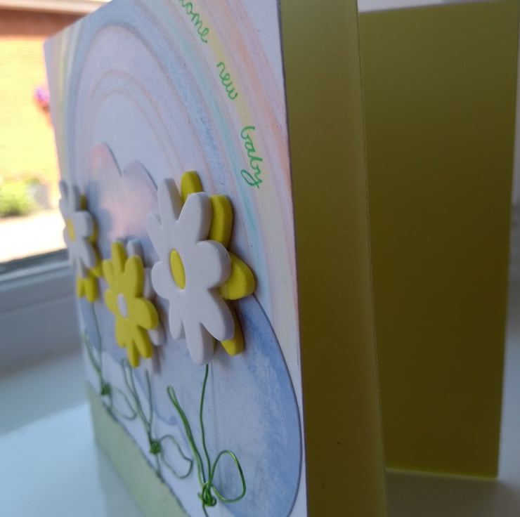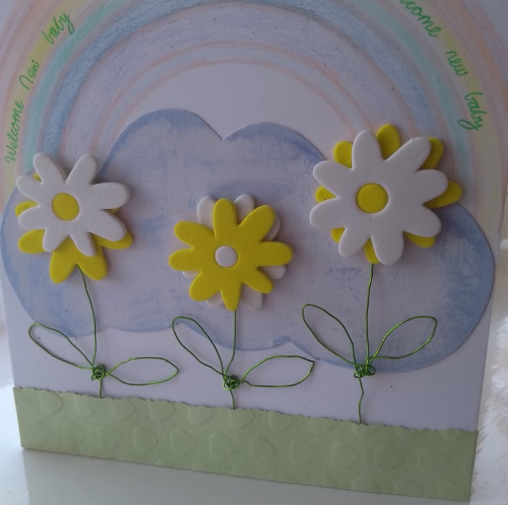 A completely handmade and uniquely designed card. Consisting of a pretty pastel rainbow with the words ' welcome new baby' handwritten in green ink. A cloud and three daisies made from funky foam with green metal stems growing from a heart embossed green border. There is room on this border for the new baby's name.