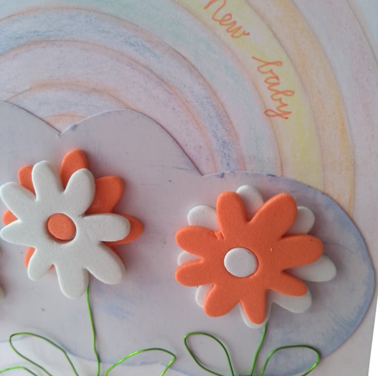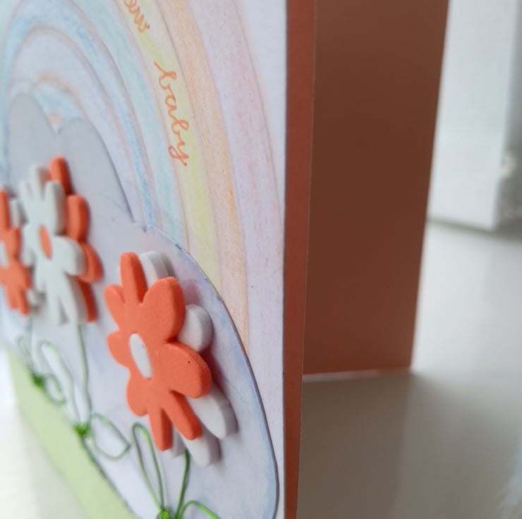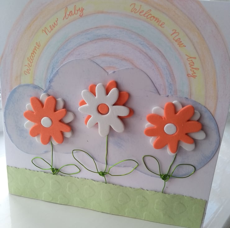 A completely handmade and uniquely designed card. Consisting of a pastel rainbow with the words , welcome new baby' handwritten in orange ink. A cloud and a row of three daisies made from foam with metal stems and leaves growing from a border of green embossed card.
