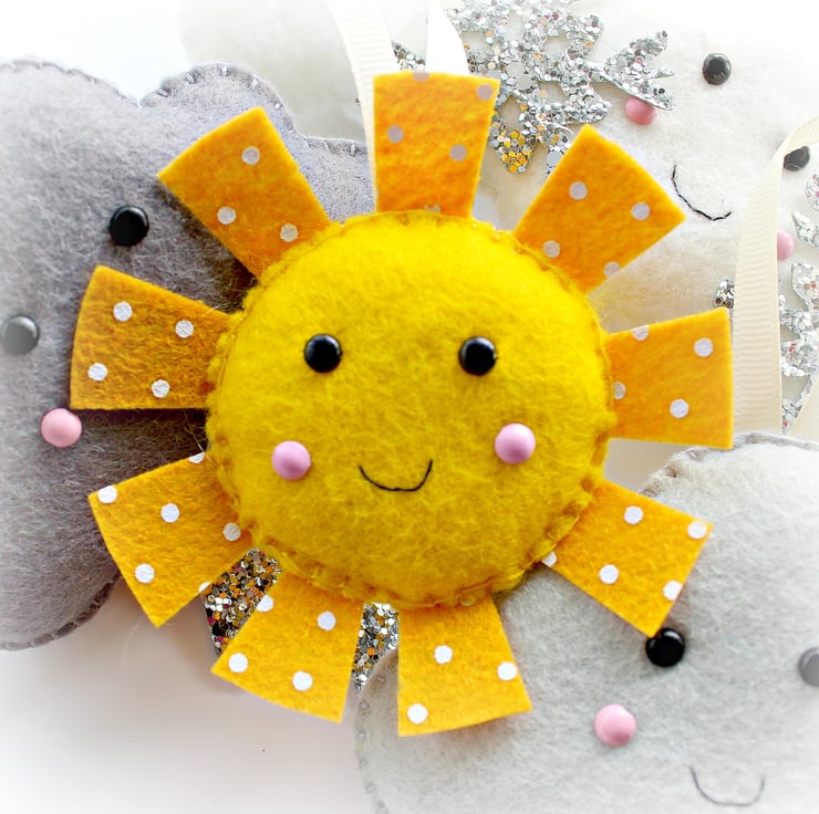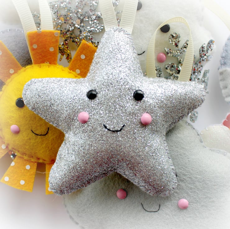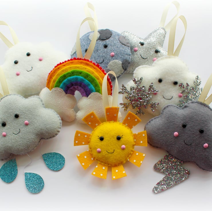 This listing is for a set of 8 felt decorations (white cloud, rain cloud, storm cloud, snow cloud, sun, moon, star, rainbow), with small ribbon loops to be strung along the supplied length of ribbon as a garland. Alternatively the decorations can be made with longer loops so that they can be hung individually, on a twiggy tree etc (if you would like longer loops please let me know during checkout, the short loops will be supplied as standard).