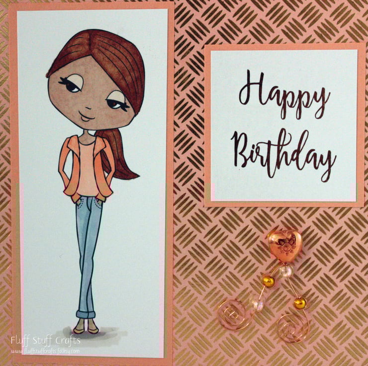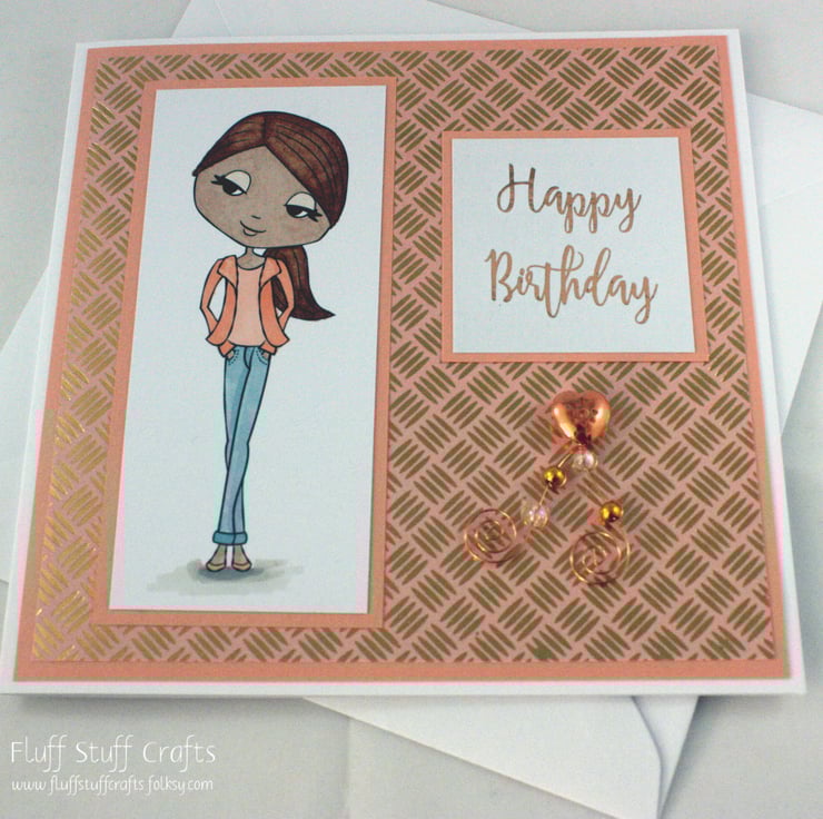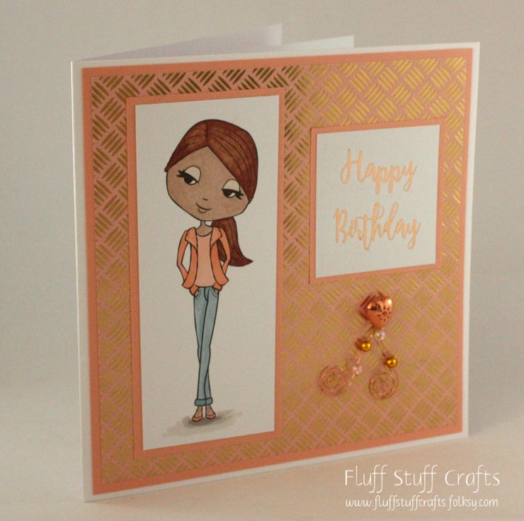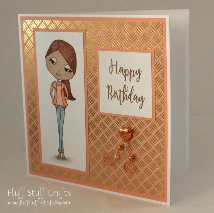 Square birthday card, featuring a hand coloured image of a young girl, which could be used for a teenager or someone in their early twenties. The image and sentiment, reading 'Happy Birthday' in rose gold foil, have both been framed with peach card and overlaid onto a peach and gold patterned background. There is a small embellishment made up of a small rose gold heart and beads on rose gold twisted wire.