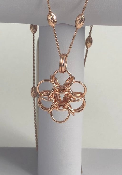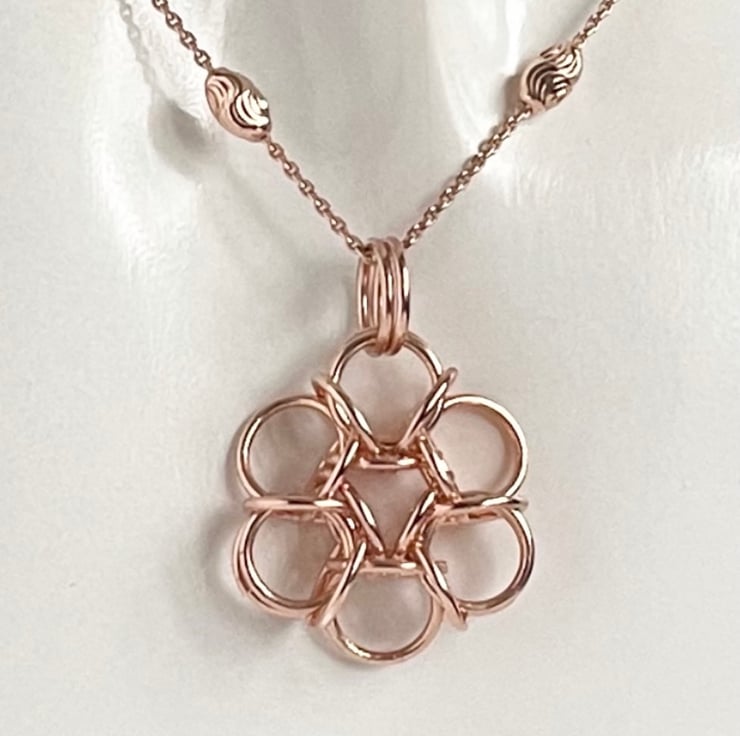 I’ve used individual Sterling Silver Rose Gold plated rings to form this beautiful flower Chainmaille weave.