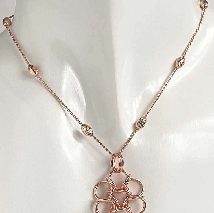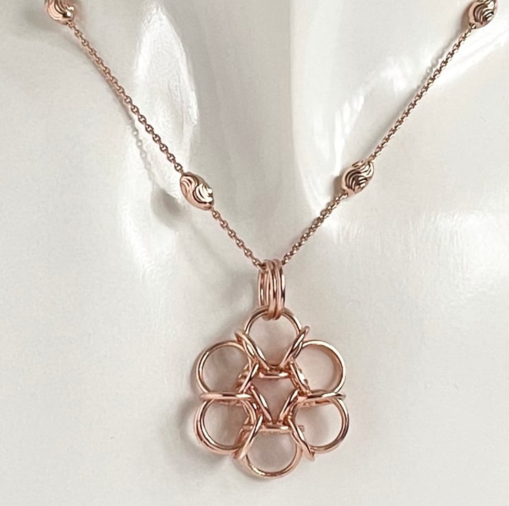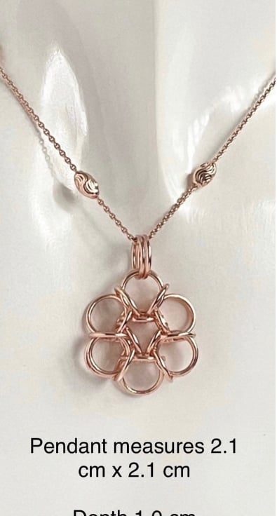 I’ve used individual Sterling Silver Rose Gold plated rings to form this beautiful flower Chainmaille weave.