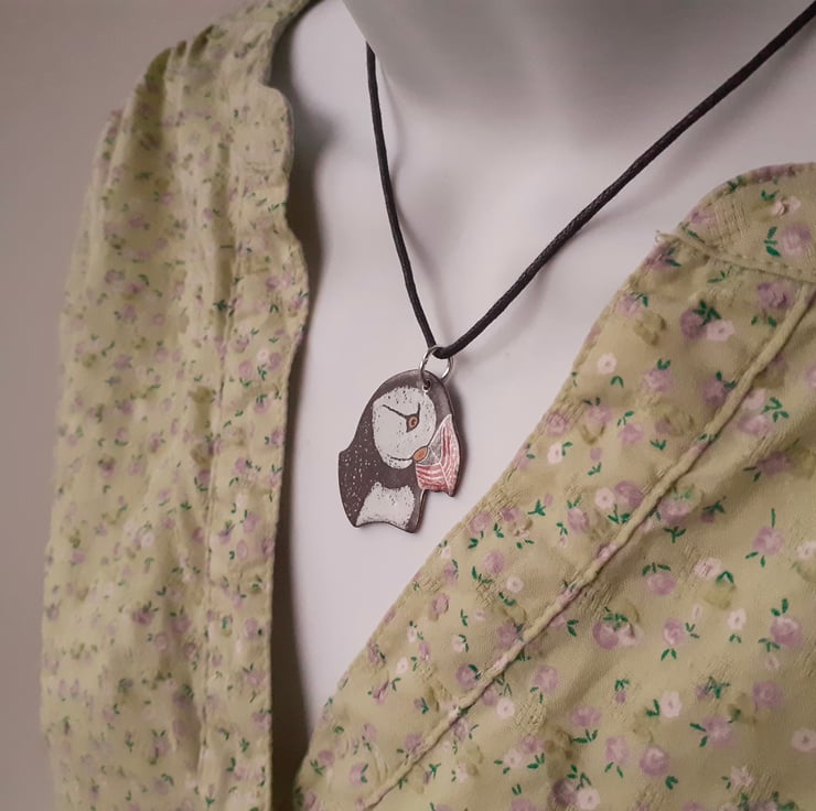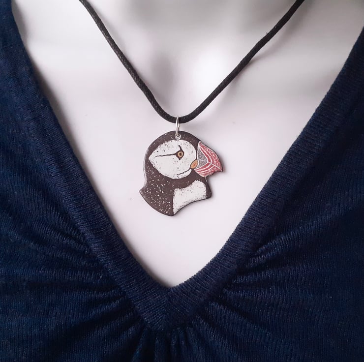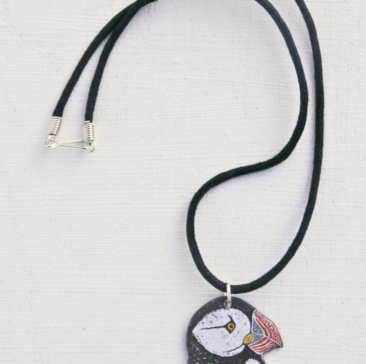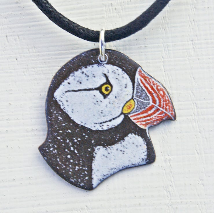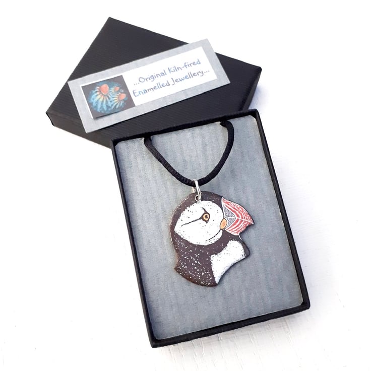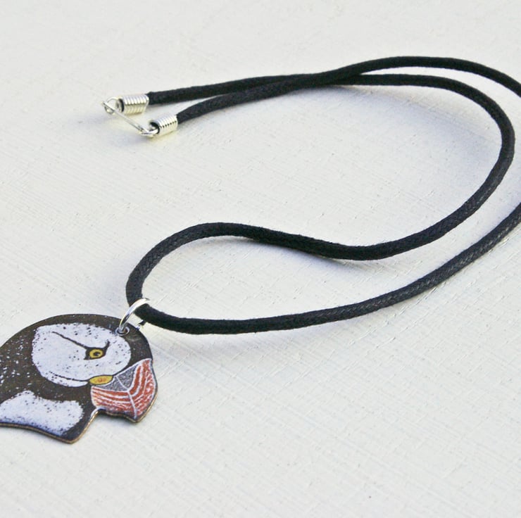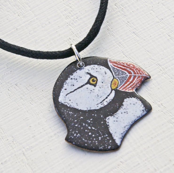 Puffin Head Pendant - This colourful bird is great to make in enamels. I hand cut the copper shape, so you can be sure the design is unique to my work. The Puffin Head measures about 4cm in height and width. Both sides of the copper are enamelled, several firings on both sides are needed as the enamel powder is applied in layers, with the details of the bird’s face being the final layer The enamel on the reverse adds strength and resilience this piece of jewellery. The Puffin Head pendant hangs from a black cord with silver-plated hook fastener which I offer in a variety of lengths. It is presented in a quality card gift box and sent in an outer card postage box by Royal Mail ‘Signed for’ postage.