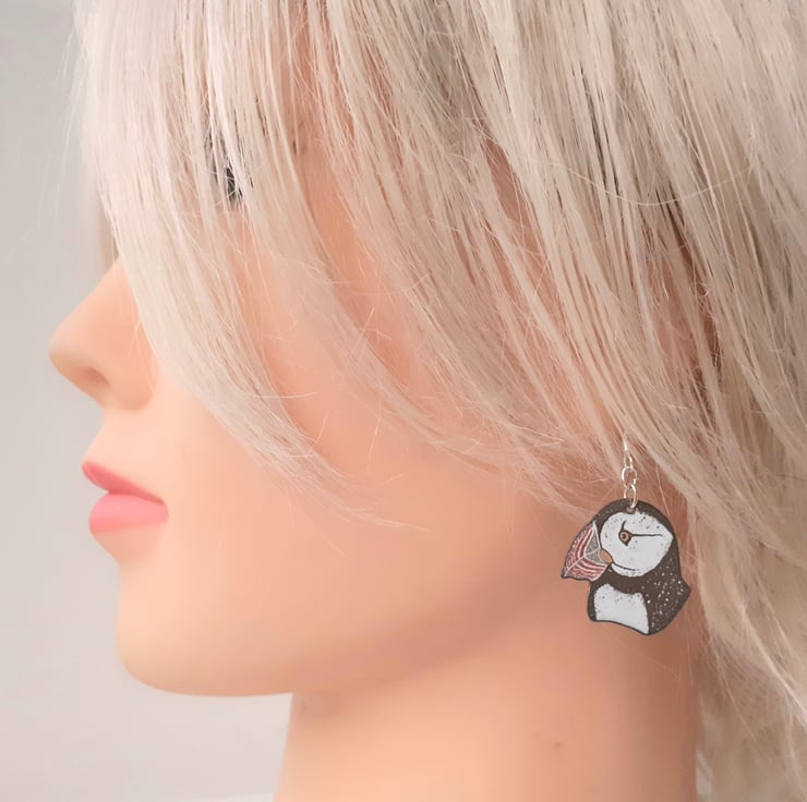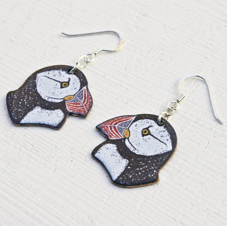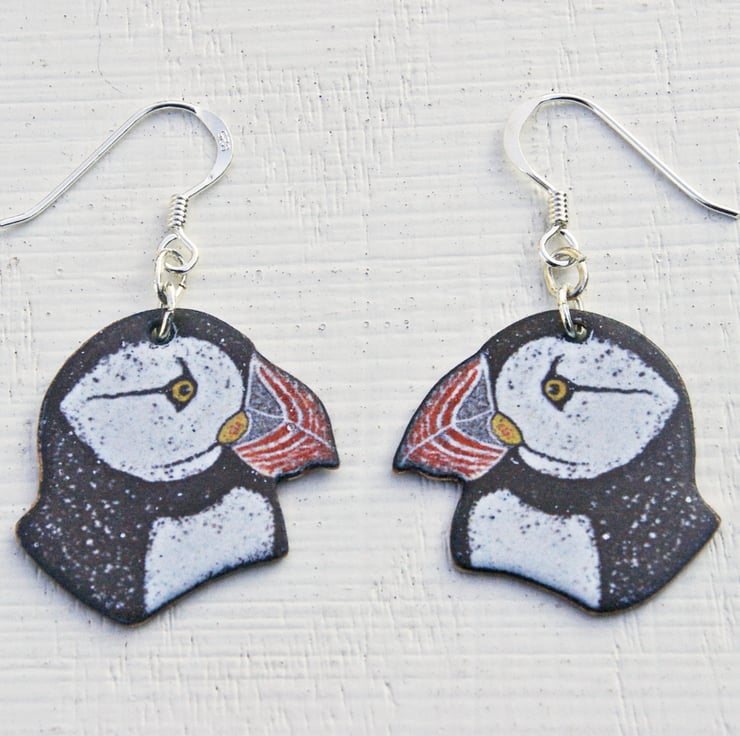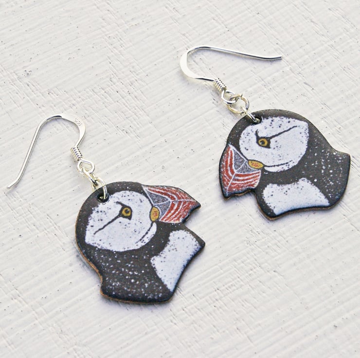 My Puffin Head Earrings are hand cut in copper in a shape unique to my work. Once cut the copper is enamelled on both sides in layers, and has to be fired several times before the final bird features are added to the earrings. The enamel on the reverse adds strength and durability. The earrings hang from silver fish hook earwires. and are presented in a gift box. The Puffin head earrings are sent with an outer packaging box by Royal Mail ‘Tracked’ postage.