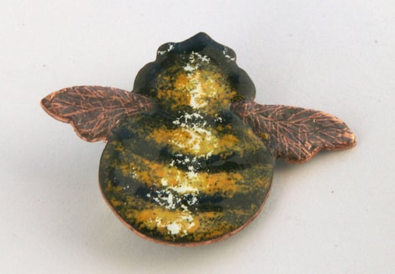 My Bumble Bee Brooch is about 4cm long, I hand-cut the shape in copper so, you can be sure of a design unique to my work. The copper is enamelled in several layers with firings in between and on both sides, before the piece is complete. The enamel on the reverse adds strength and durability. The final layer is when the wing details, stripes, and highlights are applied. It has a silver-plated brooch/pin fastener attached. The Bumble Bee brooch is presented in a gift box and sent in an outer card packaging box by Royal Mail 'Tracked' postage.