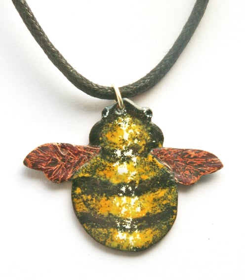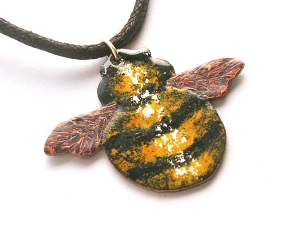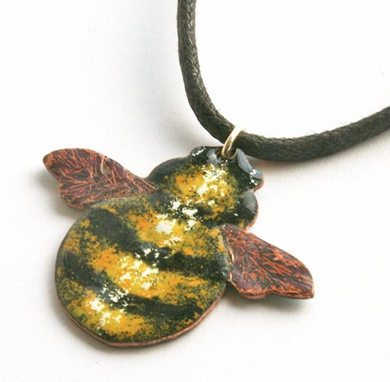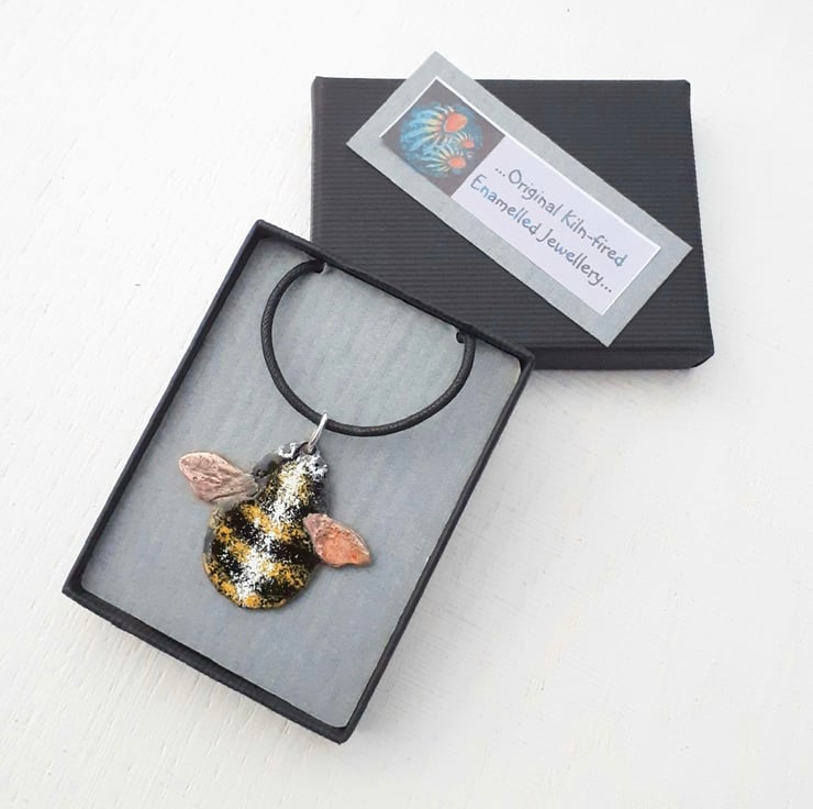 My Bumble Bee Pendant is about 4cm long. I hand-cut this copper shape so, you can be sure it is a design unique to my work. Once cut the pendant is enamelled on both sides, this process takes several layers with firings in between. The Bumble Bee pendant is about 4cm long. The enamel on the reverse is gives strength and resilience. The final layer is the one where the stripes, highlights and wing details are applied, before the piece is finished. The Bee pendant hangs from a black cord which I offer in a variety of lengths with a silver-plated fastener. The Bumble Bee pendant is presented in a gift box and sent in an outer card packaging box by 'Tracked’ Royal Mail postage.