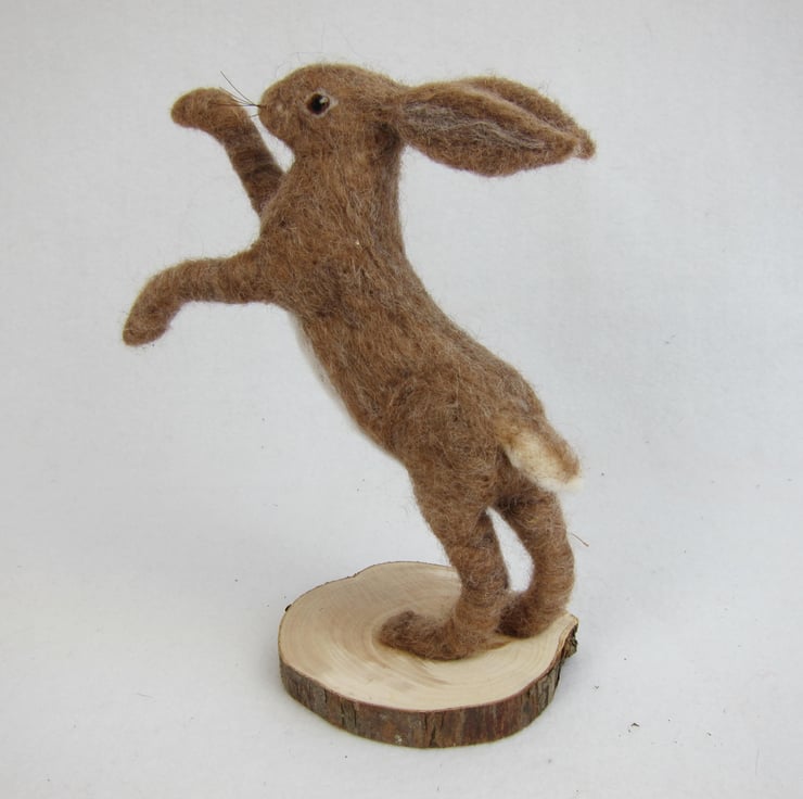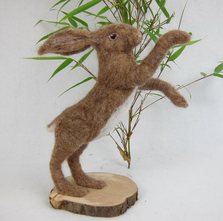 This boxing hare has been needle felted using corriedale woollen fibres. It has been felted over a wire armature to give it stability and is mounted on a rustic wooden base. A barbed felting needle has been used to felt the fibres and sculpt them into shape. A white bob tail and horse hair whiskers have been added.