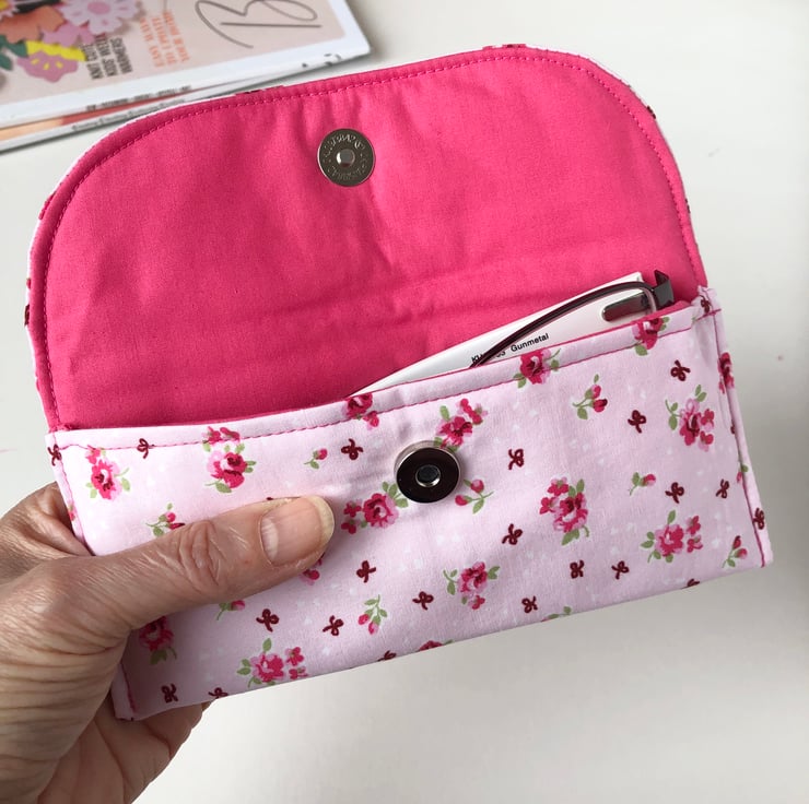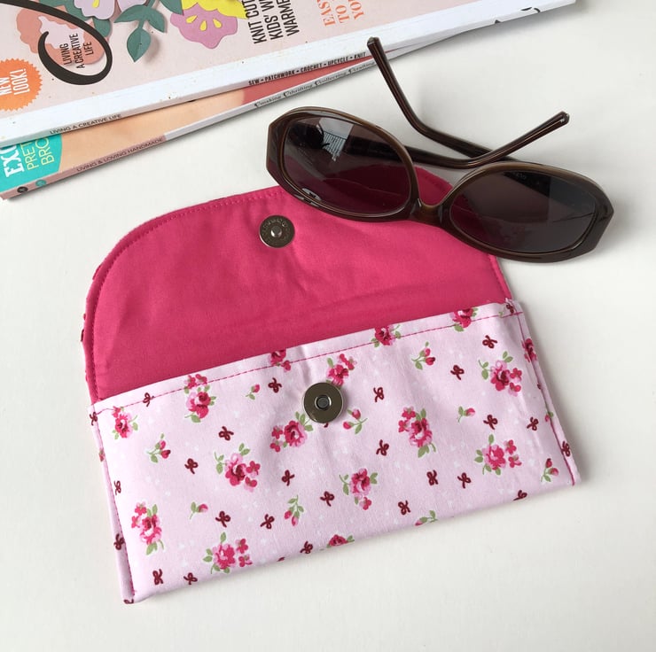 This pretty pink floral glasses case is ideal for your glasses or sunglasses. It is handmade in a lovely pink fabric with darker pink flowers and lined with a complementary plain dark pink fabric.