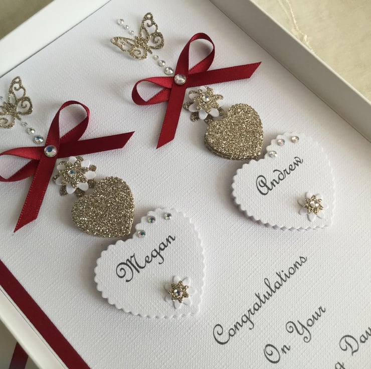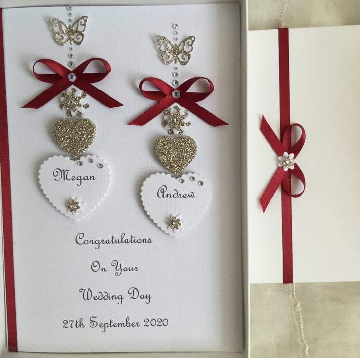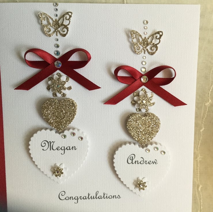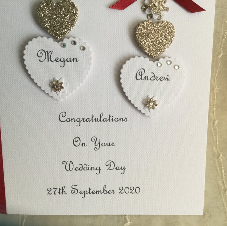 This handmade personalised card is A5 in size ( 210mm x 150mm) and is on 300gsm heavyweight linen cardstock. This card can be for a wedding day, engagement, any anniversary or any special occasion for a couple. This claret and champagne gold hearts card is embellished with ribbons and gems.
