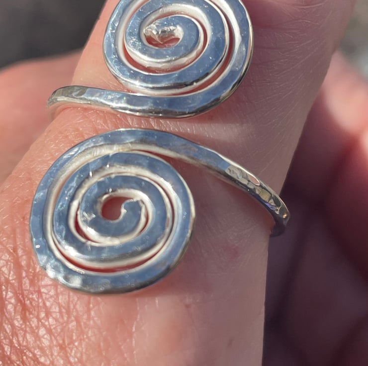 Each end of the ring elegantly curls into a stunning spiral, featuring a hammered texture that adds both simplicity and a touch of bohemian flair. This eye-catching piece is designed for comfort and style, making it a delightful addition to any jewellery collection.