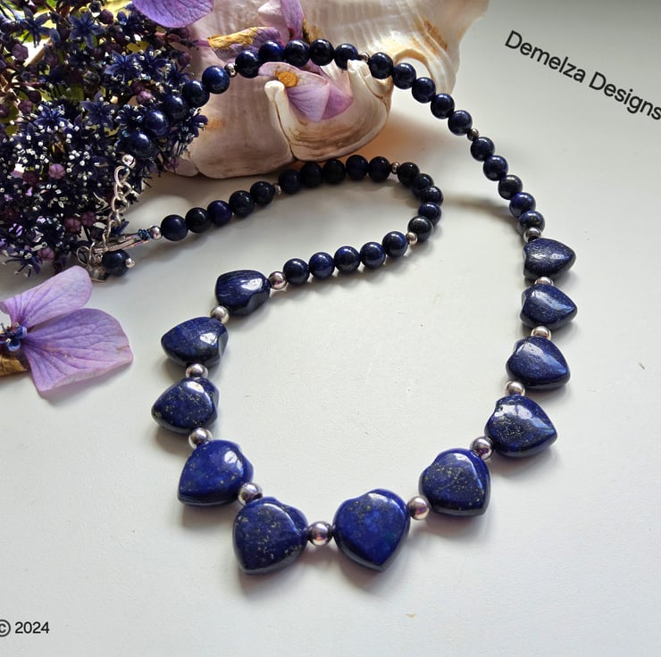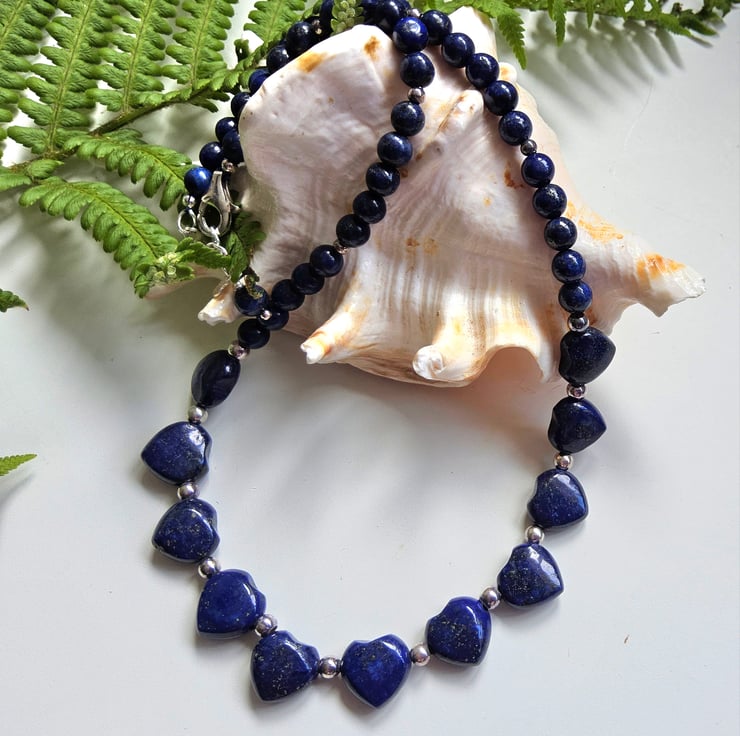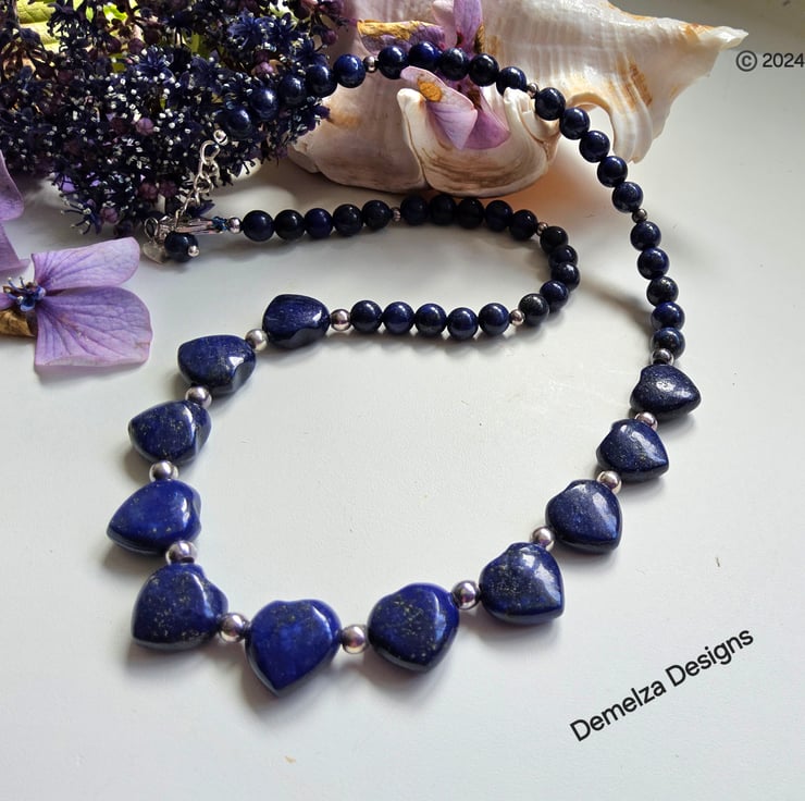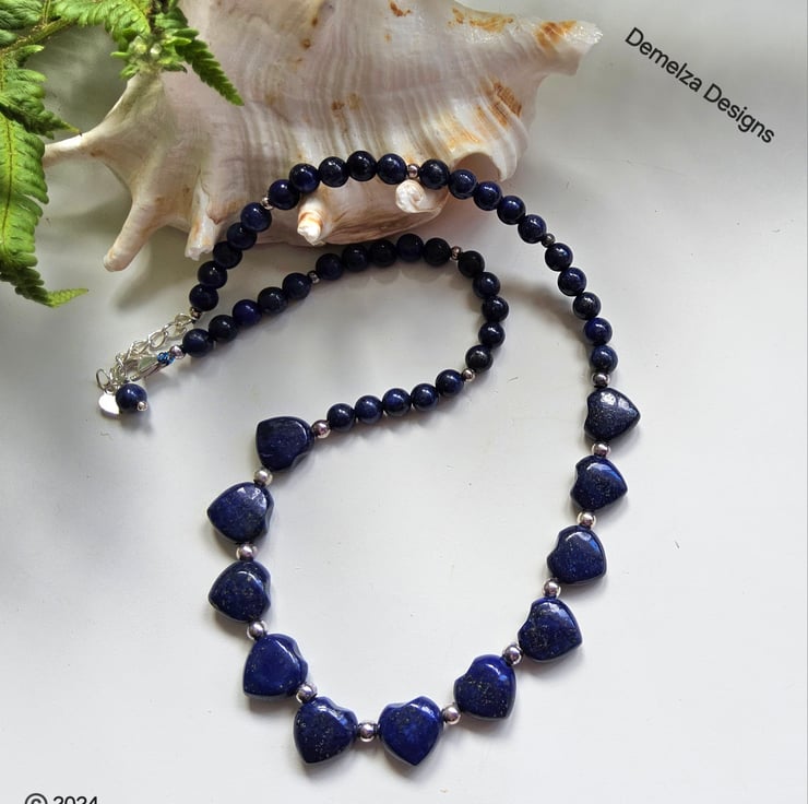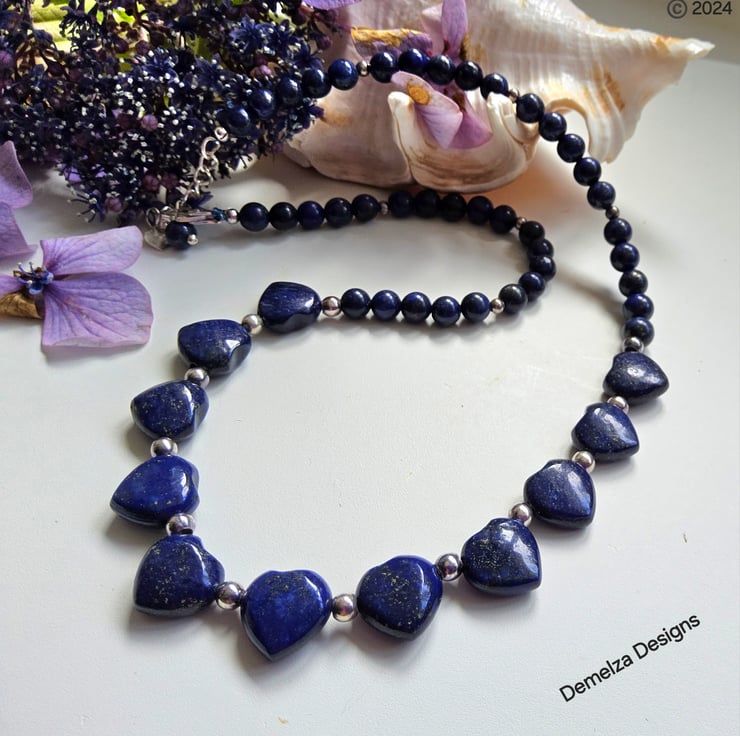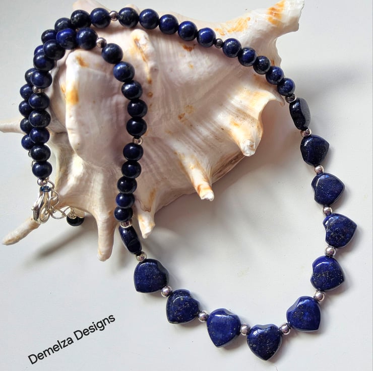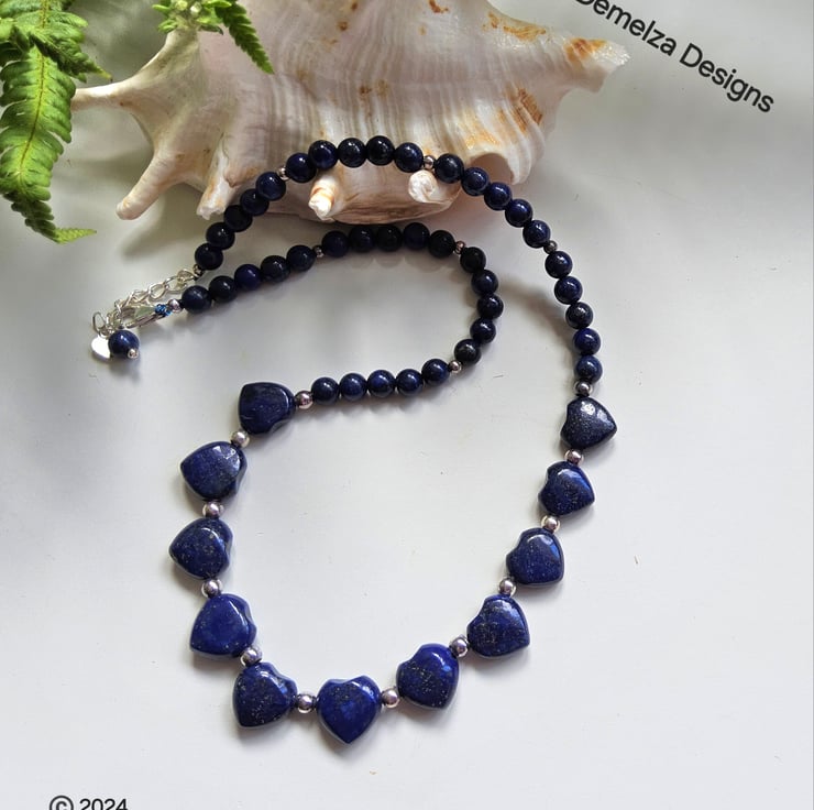 A lovely eye catching necklace designed and hand crafted using heart shaped lapis lazuli gemstone beads with lapis lazuli 6mm rounds. Between the heart cuts are 3mm faceted cut sterling silver spacer beads with 2.5mm plain sterling silver beads between the rounds set in stations. For the main construction professional coated stainless steel jewellers wire has been used for added strength and lasting durability, finished off with a sterling silver clasp and extender chain.