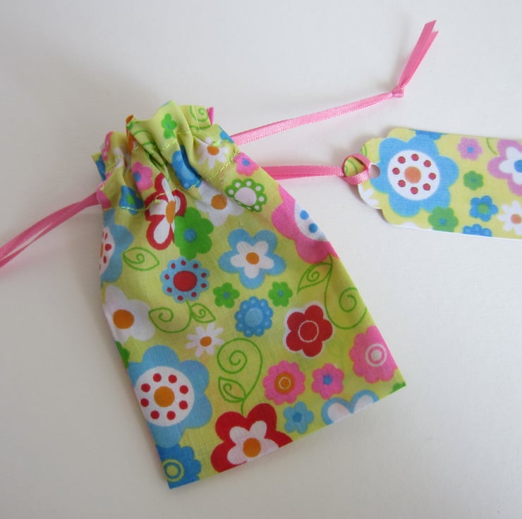Comes complete with fabric flower drawstring gift bag and matching card flower gift tag.