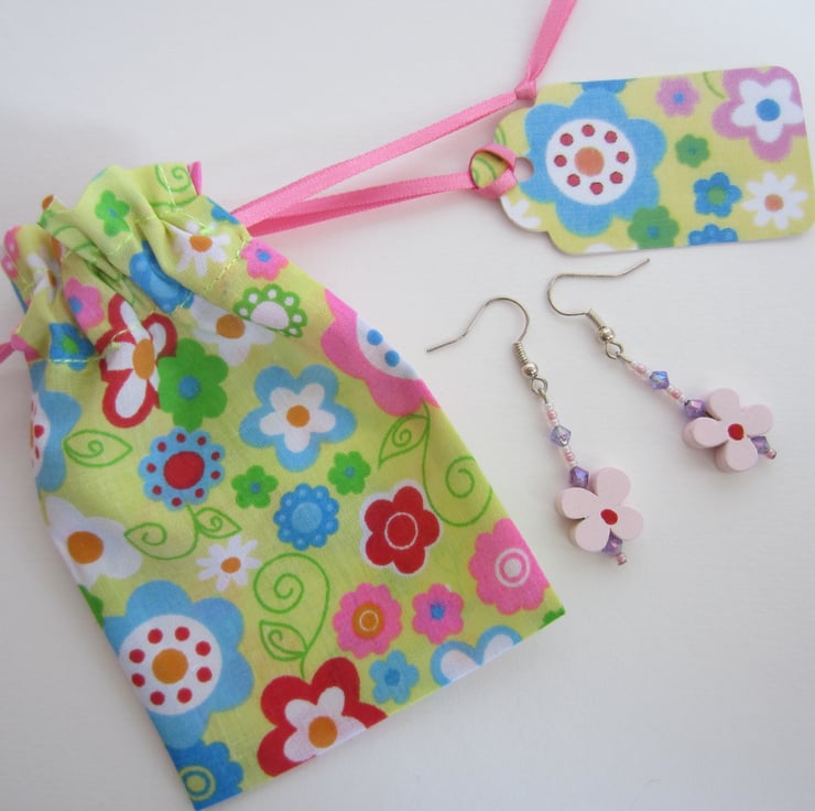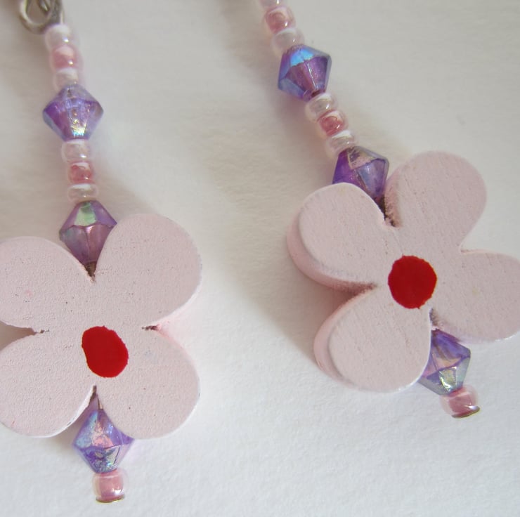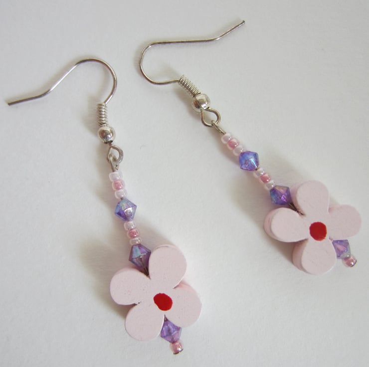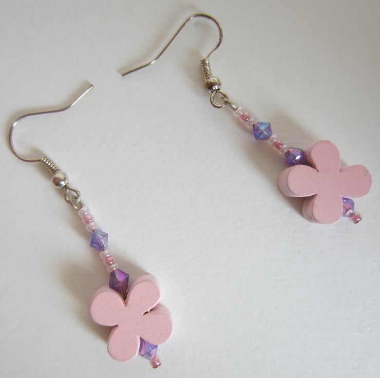Pretty earrings made from painted wooden pink flower beads and other lilac and pink beads. They hang from silver plated ear wires and measure 3.5 cm long.