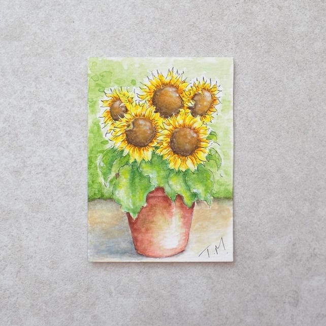 Size: 2.5 x 3.5 inches. My original ACEO 'Sunflower' has been painted using quality watercolour paint on 300gm watercolour paper. It has been signed on the reverse and comes complete with a signed certificate of authentication and protected in a clear cellophane sleeve.
