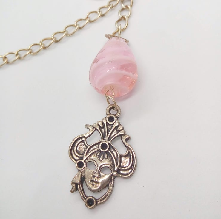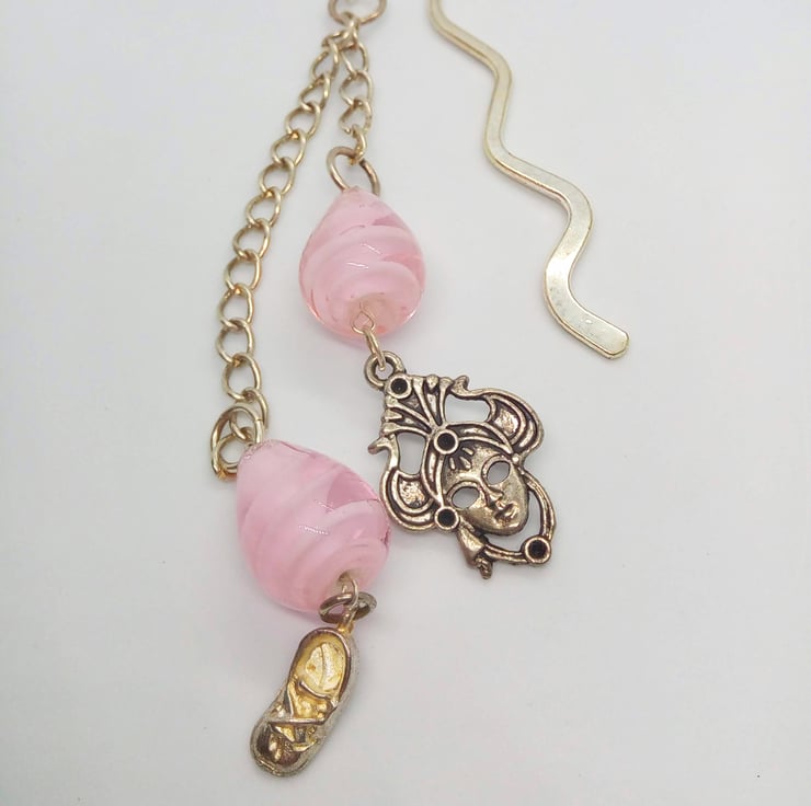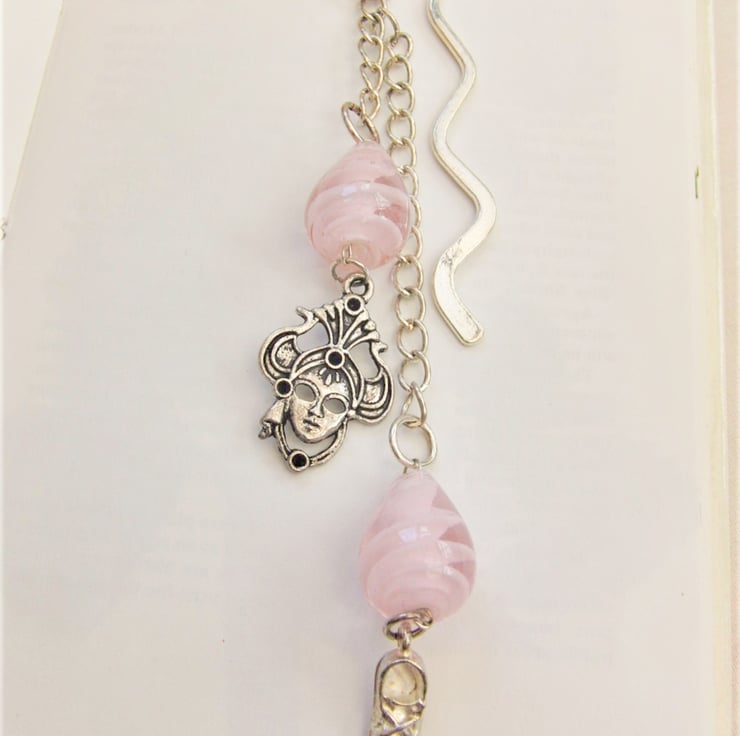 The bookmark is silver plated and in the shape of a squiggle. It has 2 pink clear glass tear drop beads with a white swirl pattern inside and silver plated masque and baby shoe charms suspended from silver plated chain.