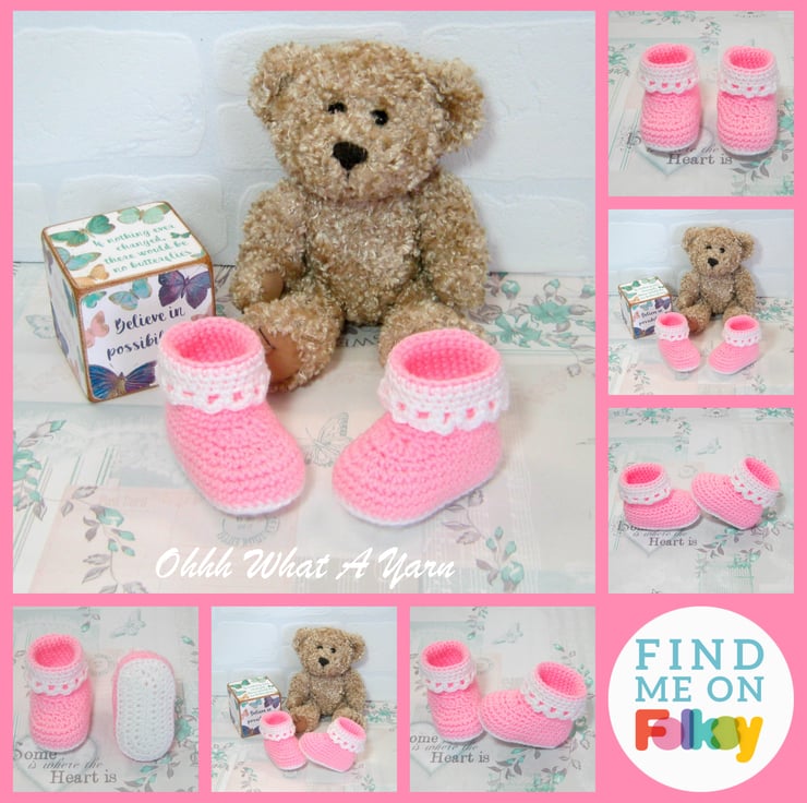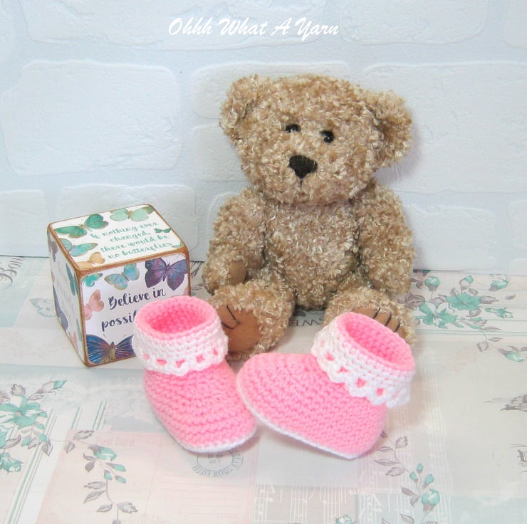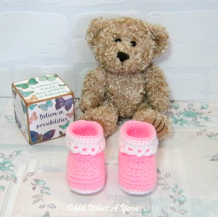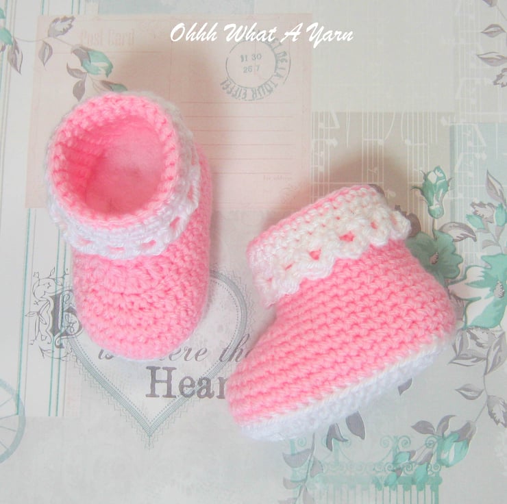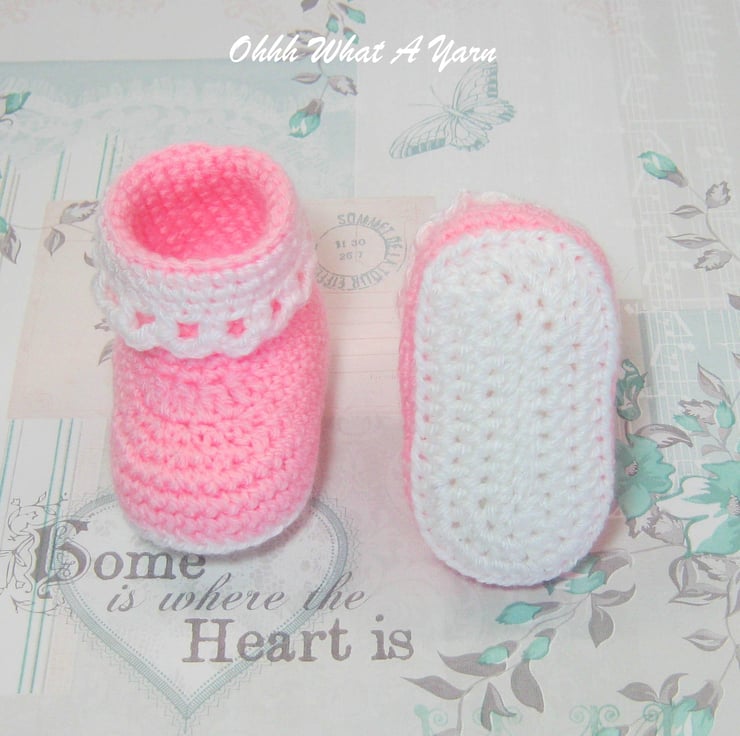 The sole is crocheted in contrasting white yarn and the body of the boot is crocheted in pastel pink. They have a fold down frilly white edging around the upper of the boots.