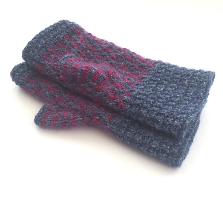 Stunning patterned fingerless gloves , hand knitted gloves in Rowan's tweedy yarn and colourful mohair. Knit to my own design with feminine yet sturdy cuff and patterned glove body. Interesting detail in that the thumbs are striped. !