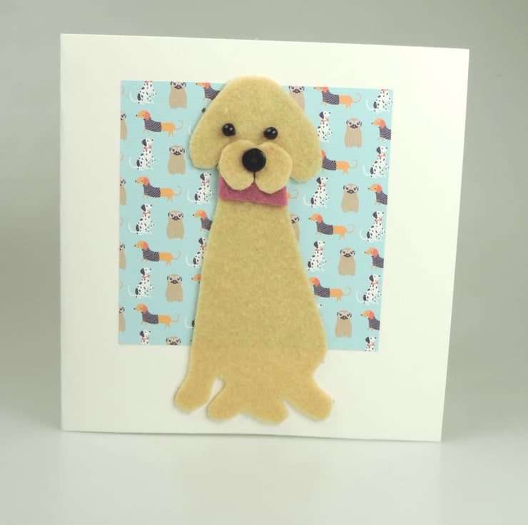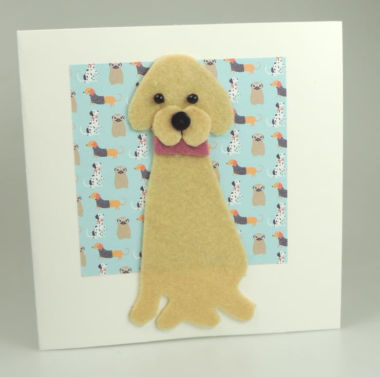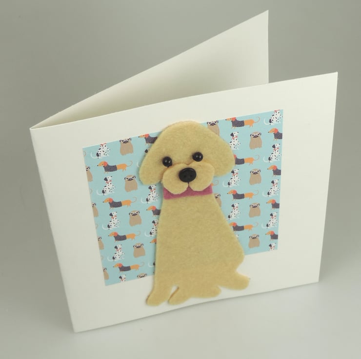 Felt yellow labrador dog , with button nose and eyes, on the front of an ivory 15 x 15cm square card. Inside has been left blank for your own message or greeting.