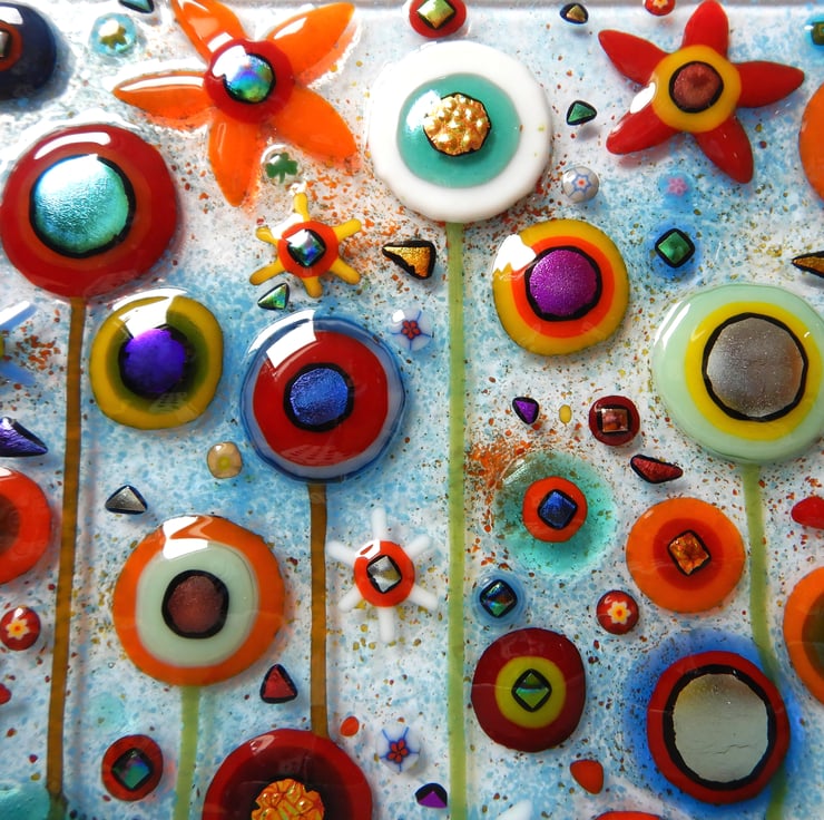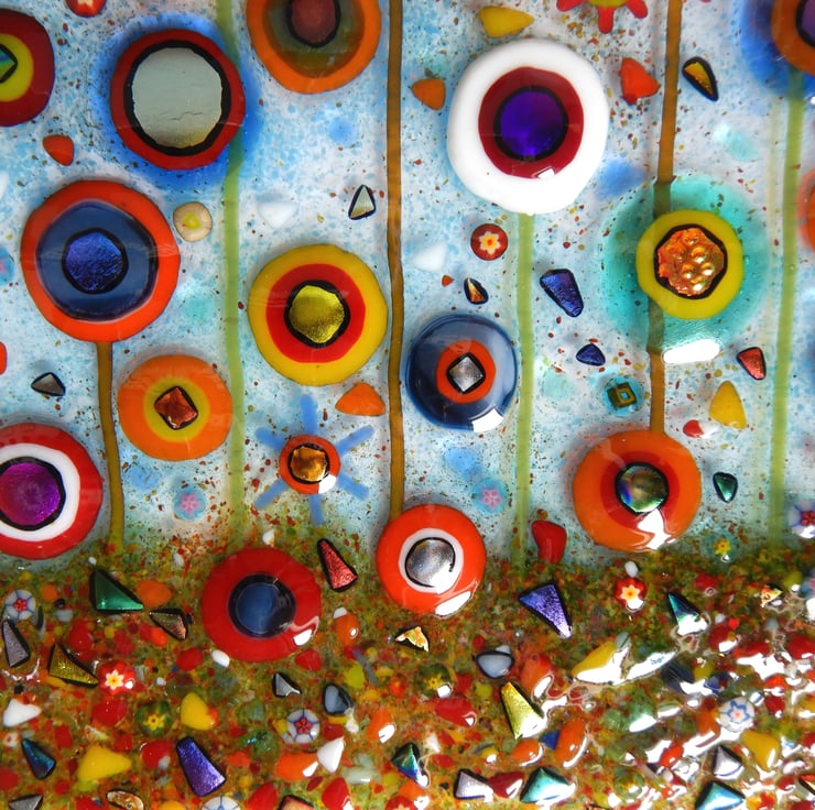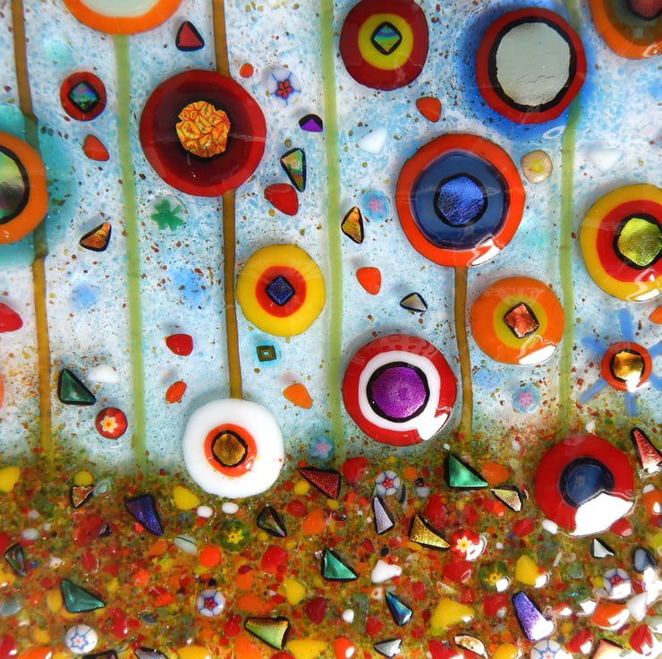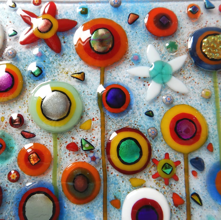 This picture has been made with extreme enthusiasm. It is almost a frenzy of colour and organised chaos. I endeavoured to squeeze in as many flowers as I could without making it too busy. I have used a variety of different glass types and techniques: glass sheet, glass stringers, frit, dichroic glass, millefiori beads, and enamelling.