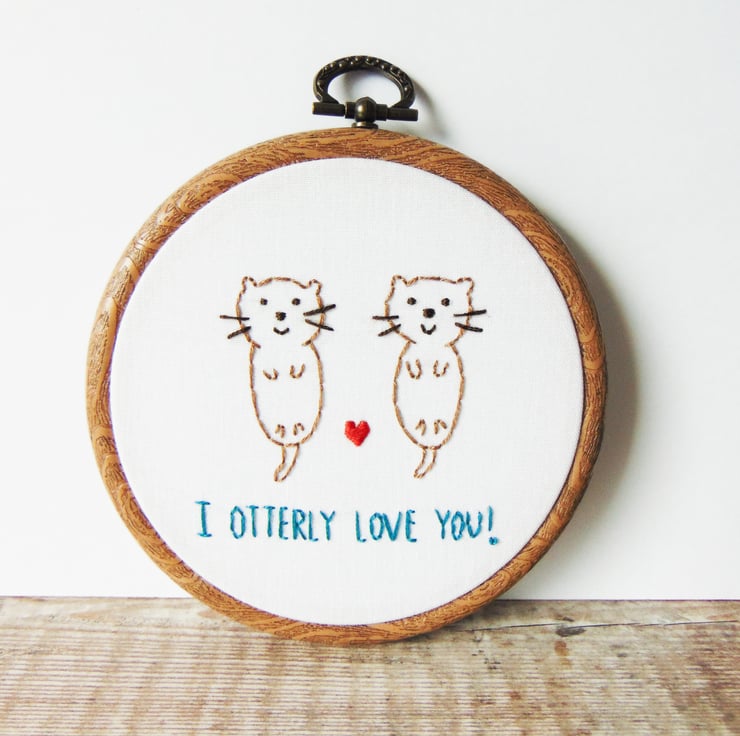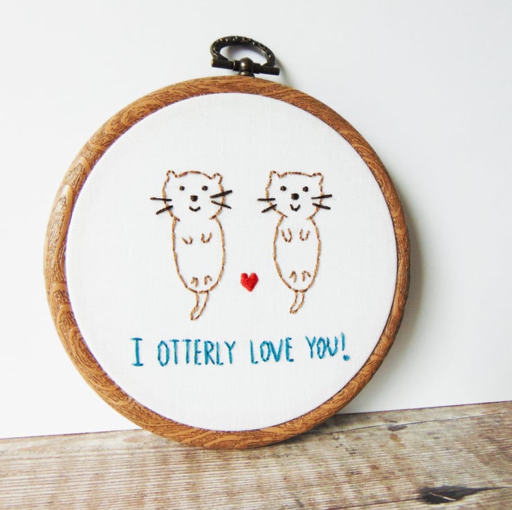 If you're looking for a cute and romantic anniversary gift for your other half then my delightful otter themed 'I Otterly Love You' hoop is perfect. It features two otters side by side with a red heart and can be personalised with any two names or the date at the bottom. It is sewn onto white cotton, any text colour and set in a four inch hoop.