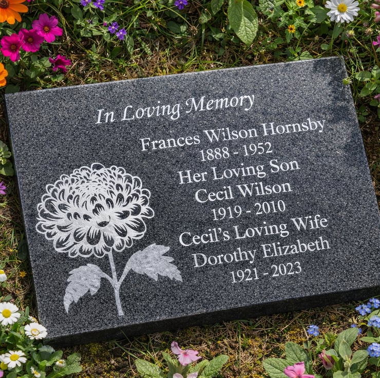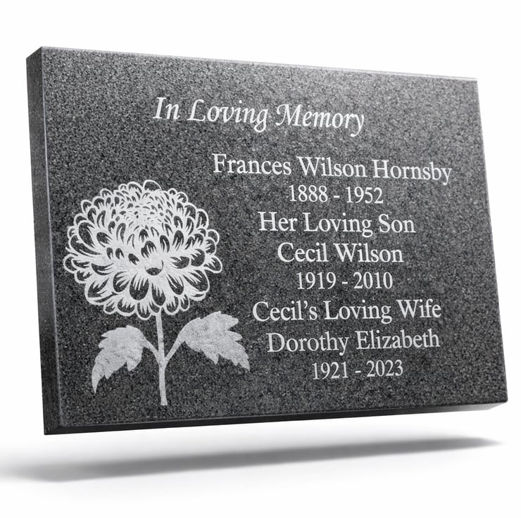 Precisely Laser Etched Directly into the Granite using our state of the art technology, for a fully weatherproof and high quality finish.