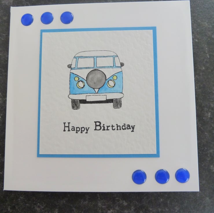 A handmade card which features a hand stamped image of a camper van with the words 'happy birthday'. It has been hand coloured and features blue card and gems.