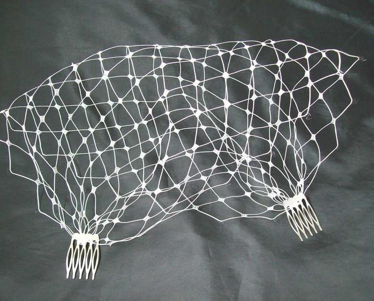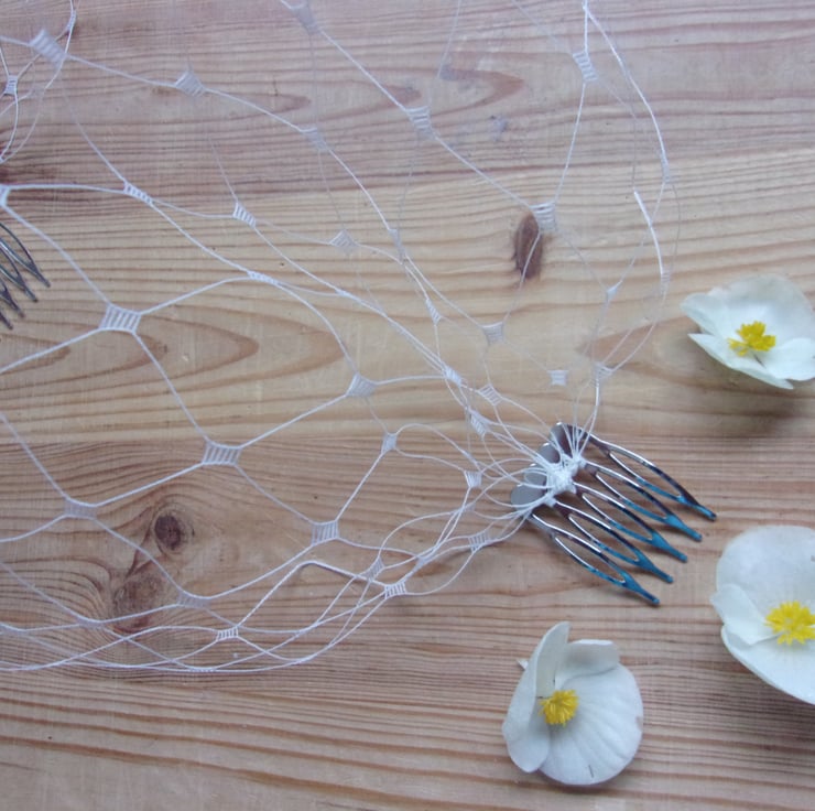 The ends of the veil are hand sewn onto two small silver or antique brass metal combs or hairgrips which can be positioned at various points on the head.