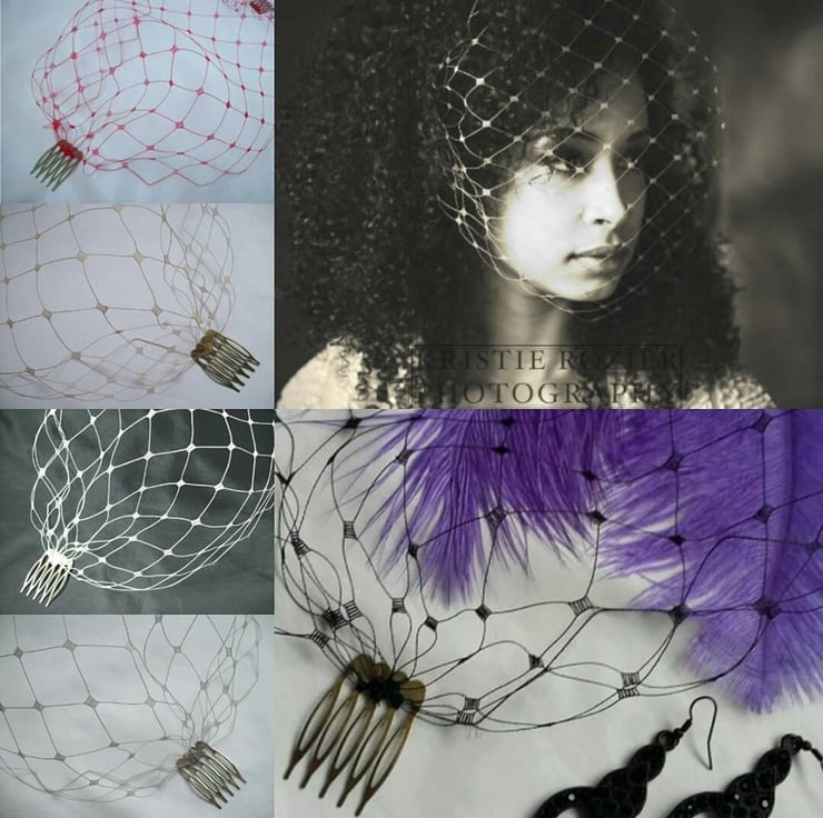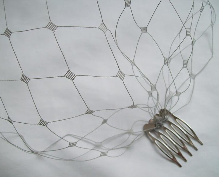 This is a dramatic full face bandeau birdcage style veil made from a Mega Merry Widow millinery veiling.