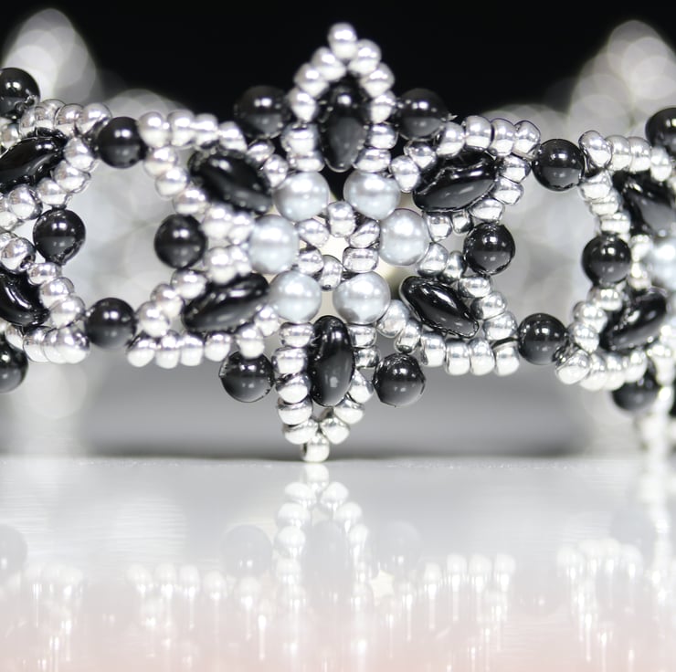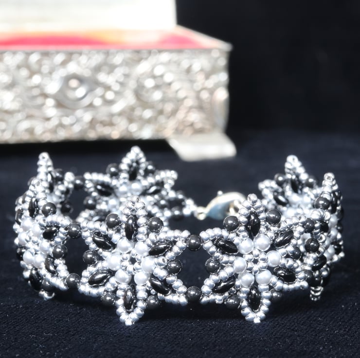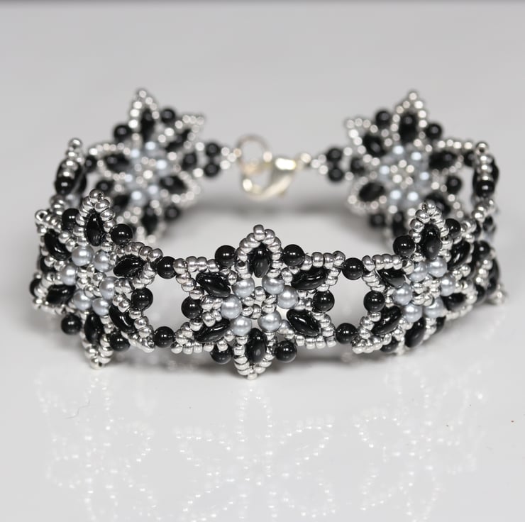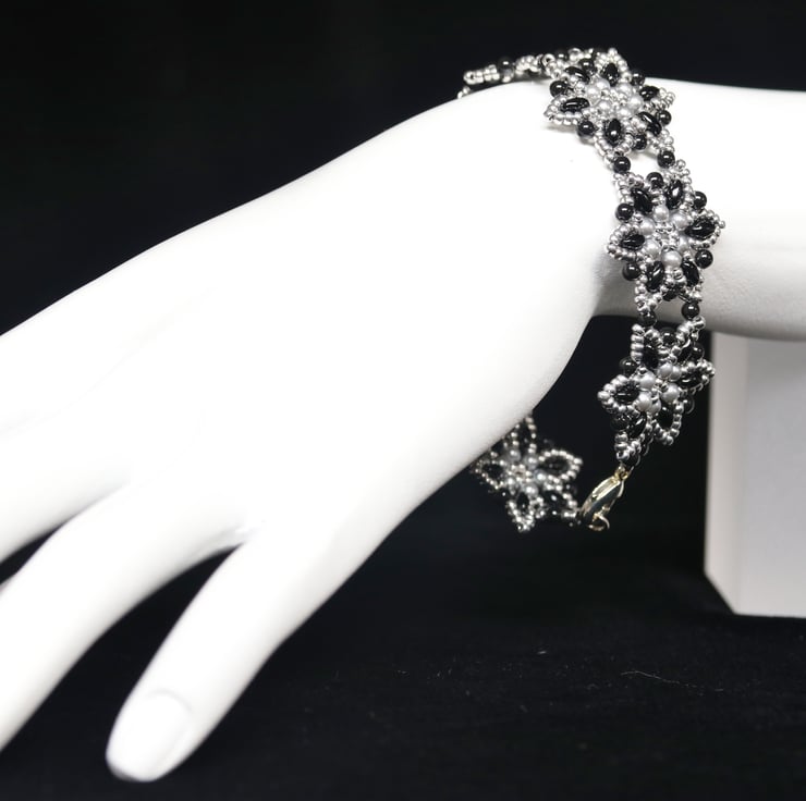 This elegant, flowery bracelet in smart silver and black uses glass beads, metallic seed beads and elliptical superduo beads, stitched together by a beadweaving process. The bracelet comprises seven starflower-shaped motifs and is finished with a silver-plated trigger clasp.