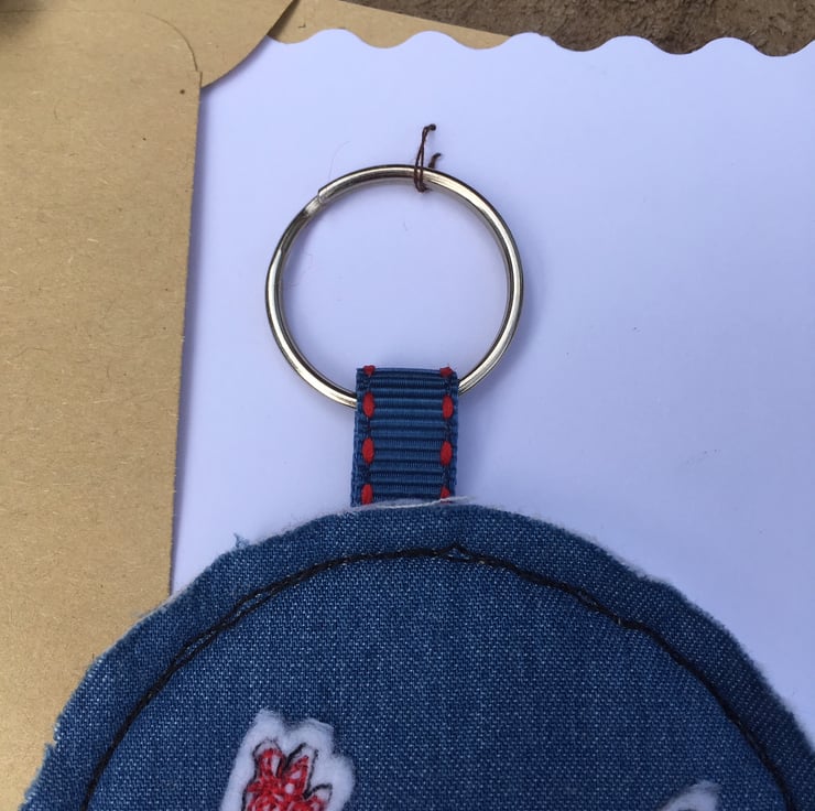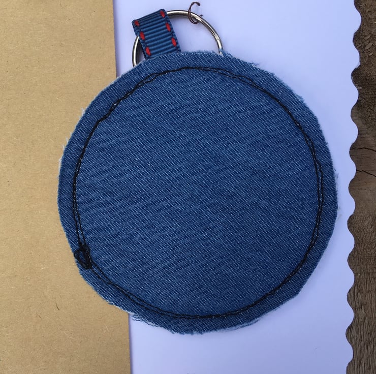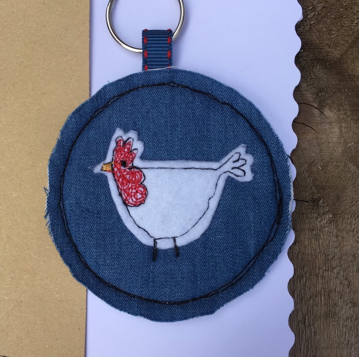 Starting with a hand-cut felt chicken, which has been free motion machine embroidered onto denim look fabric. Using felt as a stiffener, it is then backed with more denim look fabric and a ribbon loop is added.
