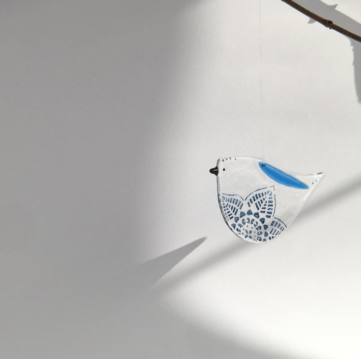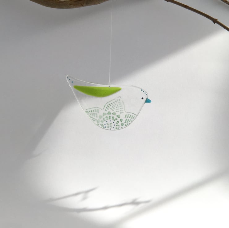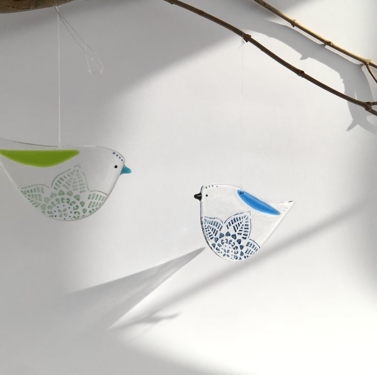 This listing is for one medium size glass bird with a colourful wing and lace flower detail on the belly. It comes on a piece of invisible thread. It is 10cm x 5.5cm and as these are handmade each bird will vary slightly. You can choose between a blue or a green one. Please go to the OPTIONS tab to select your colour.
