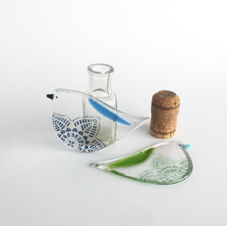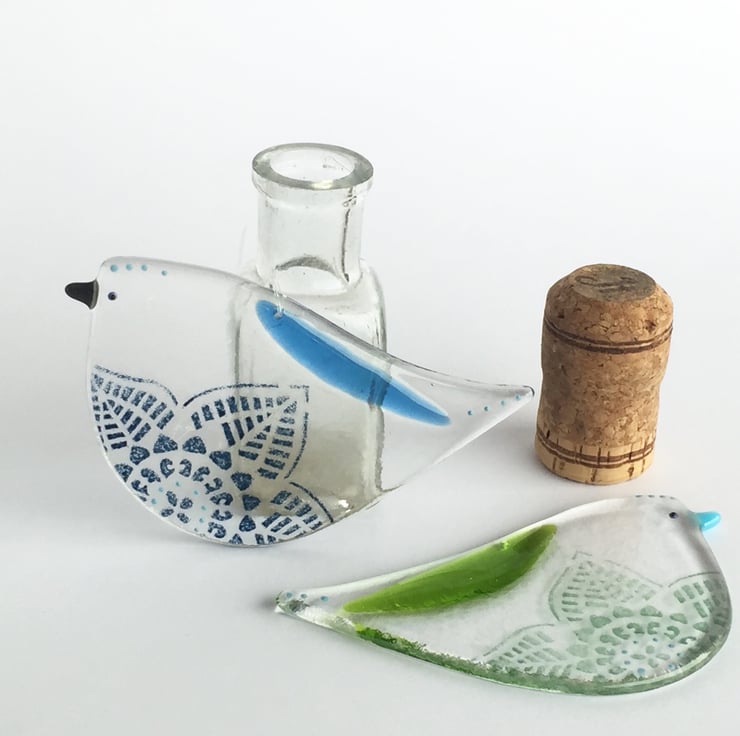 My birds are made in a specialised glass kiln where layers of glass are heated together to a temperature where the glass melts and fuses together. The design on my birds are fused in the glass and not painted on the surface.