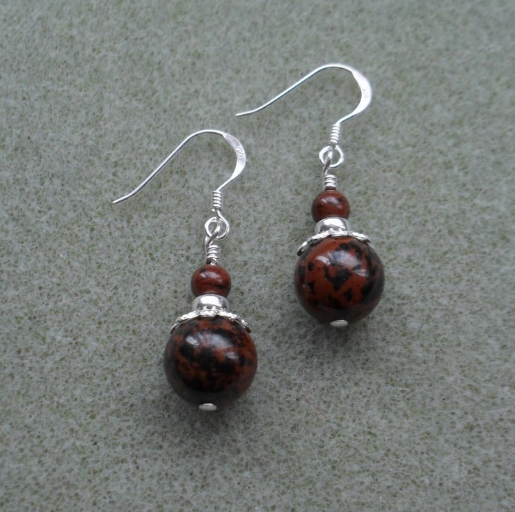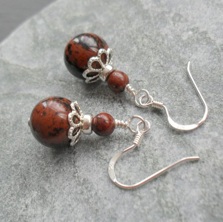 Mahogany obsidian which are a dark brick red and black in colour semi precious gemstones and sterling silver beads are attached to sterling silver ear wires