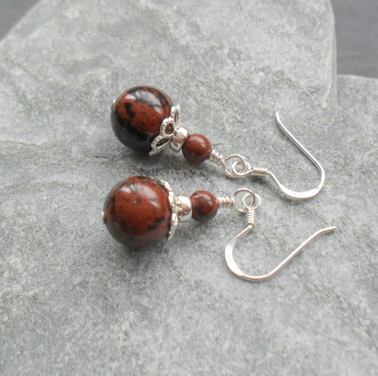 Mahogany obsidian which are a dark brick red and black in colour semi precious gemstones and sterling silver beads are attached to sterling silver ear wires