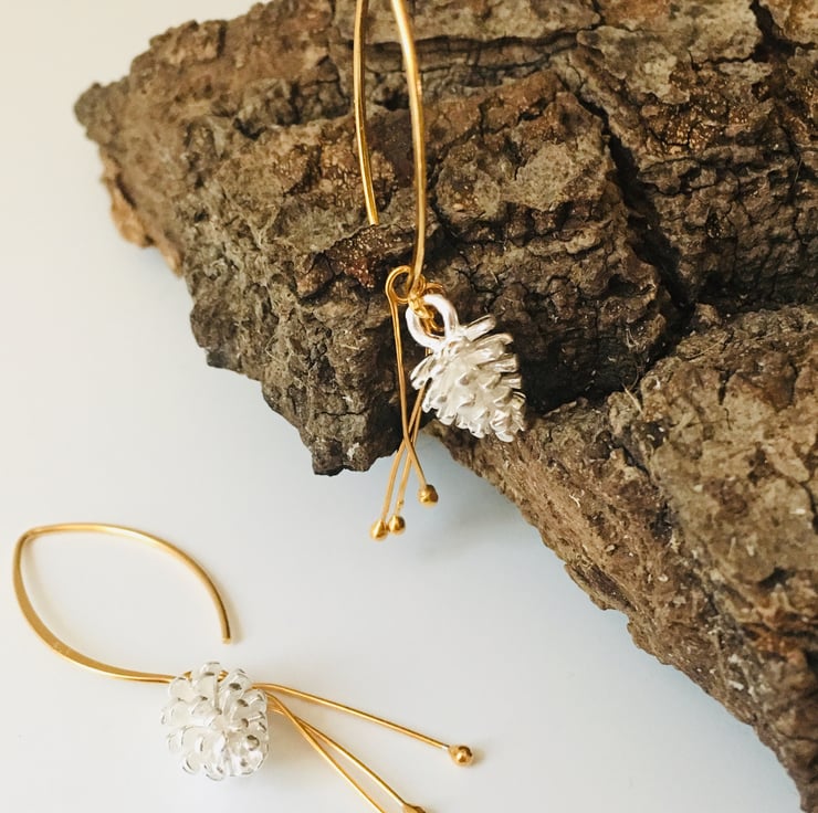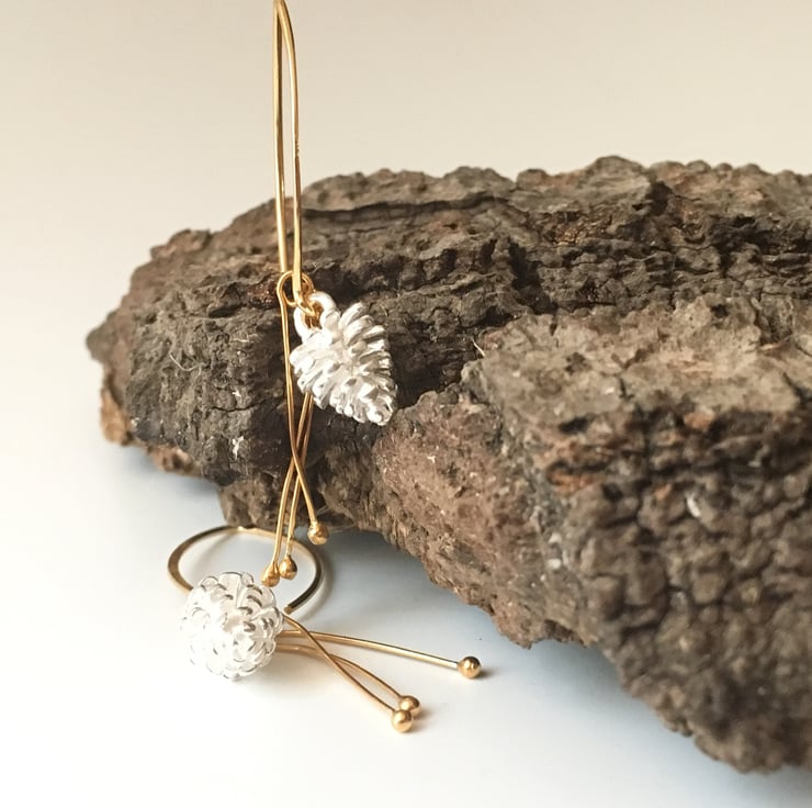 Silver & Goldplated silver Pine cones tree earrings Meduim size with gold pine needles for added impact & colour) detailed cones on textured Silver. Handcrafted in Yorkshire.