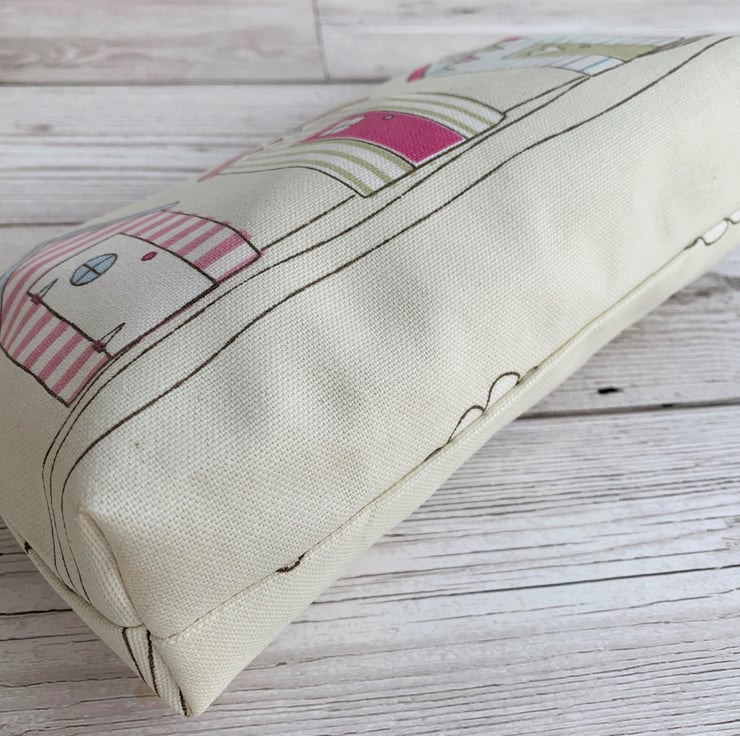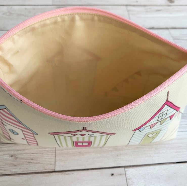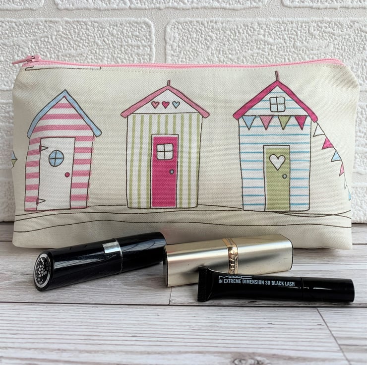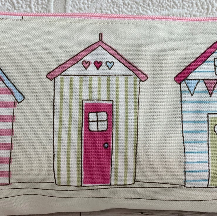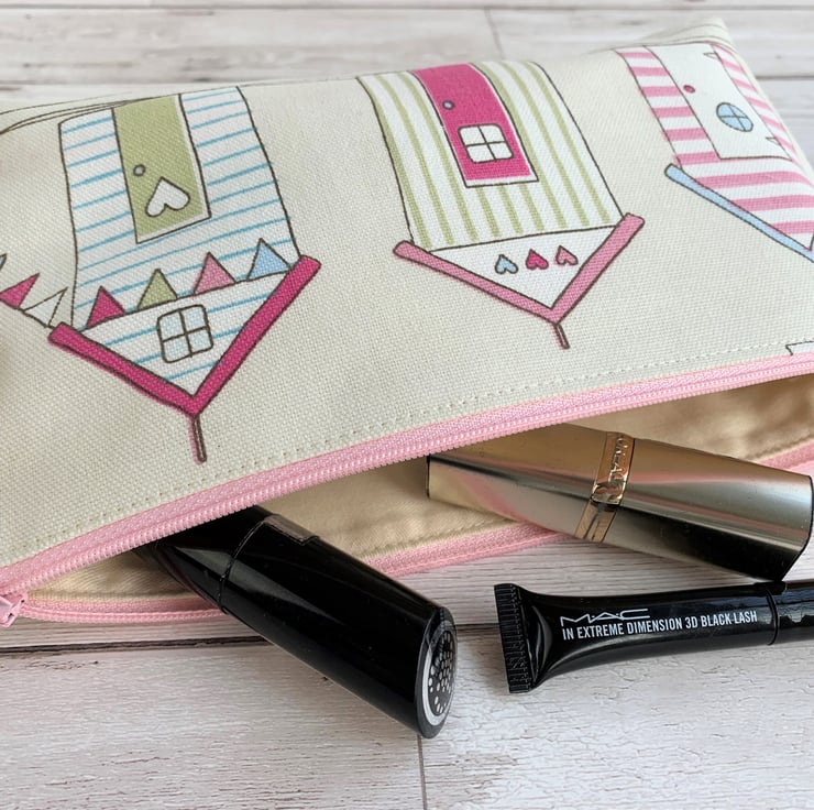 A beach huts make up bag in lovely pastel coloured fabric. The pattern features three striped beach huts in pastel shades of pink, green, white and blue on a cream background. There is also an abundance of bunting and hearts. The cosmetic bag fastens with a co-ordinating pale pink zip and is lined with cream fabric. The base of the bag is boxed giving lots of space inside.