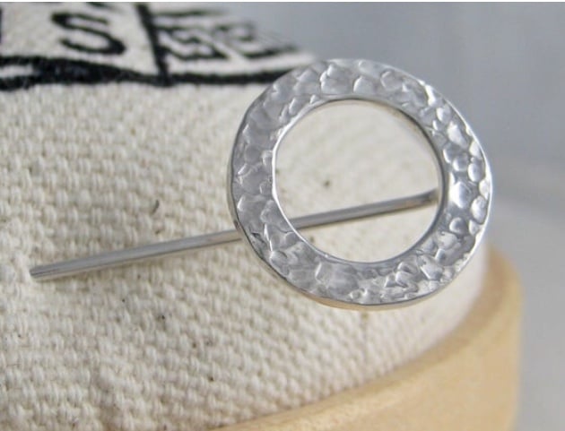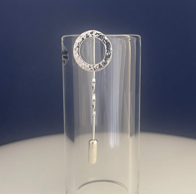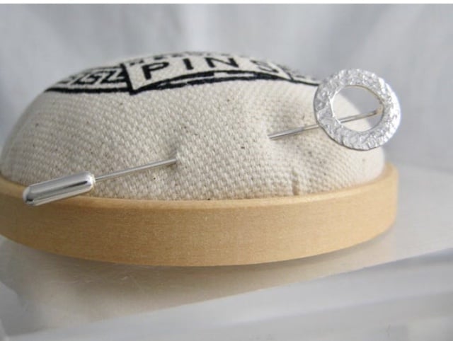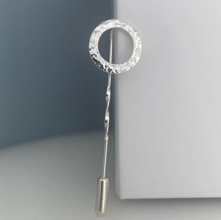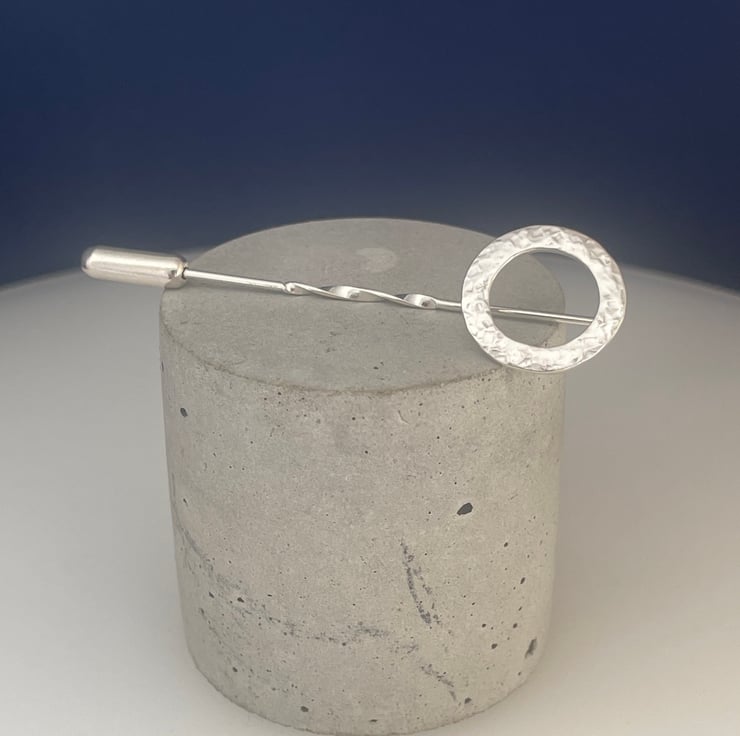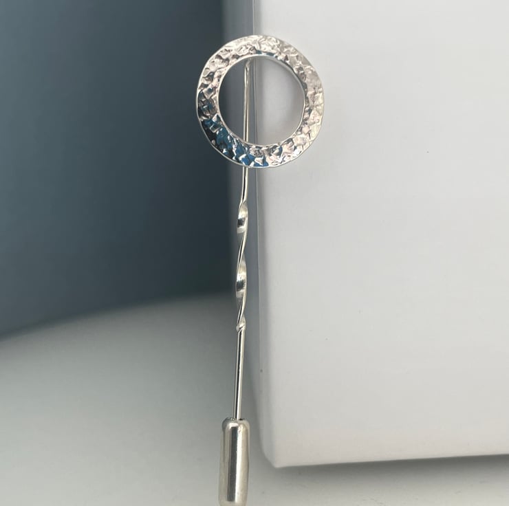 A lovely circle stick pin handmade from 925 sterling silver. Cut out by hand from solid 1mm silver wire, formed into a circular shape then hammered it to create it’s unique attractive sparkly textured surface. Set onto a twisted pin and secured with a push-on pin protector.