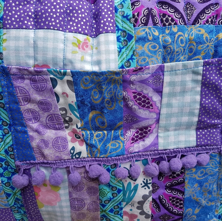This beautiful bag is massive. It measures 44 cm x 44 cm so it is big enough for a variety of uses. There is a small zipped inner pocket for money and keys, measuring 12 cm x 14 cm. There are two pockets on the outside, one with a button closure and the other with a decorative bobble edging. Fully lined, this is quirky and fun. It is made from patchwork strips sewn together, then padded and quilted. I have used many different fabrics but the lining and handles are African waxed cotton, with a bit of sparkle, for sturdiness. The bag closes with a snap closure.This is a one off item as I no longer have many of the fabrics.The handles are 90 cm long.