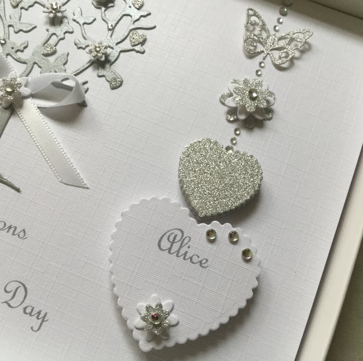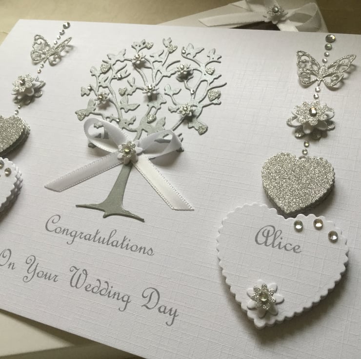 This card is personalised with the names of the couple in the hearts, along with text on the front of the card. This can include the date if you wish. Please contact me with your personalisation requirements when you place your order.