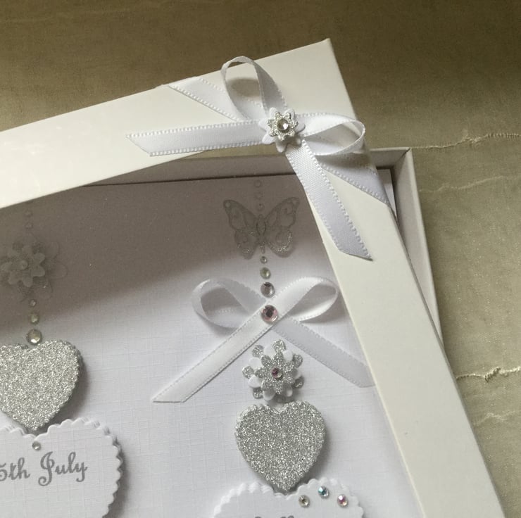 This handmade card is A5 in size (210mm x 150mm) on 300gsm heavyweight linen cardstock and can be for a wedding, engagement, anniversary or any other special occasion for a couple. This white and silver hearts card is decorated with ribbons and gems. I make each card to order and they can be personalised inside as well as on the front of the card.