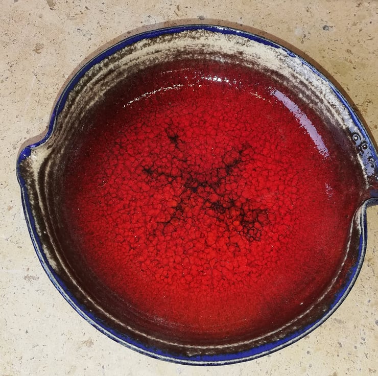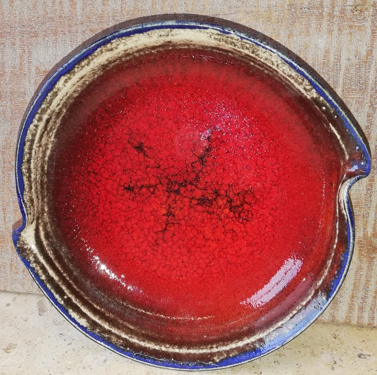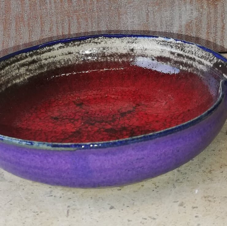 A delightful bright crackle red and purple edged small shallow dish.