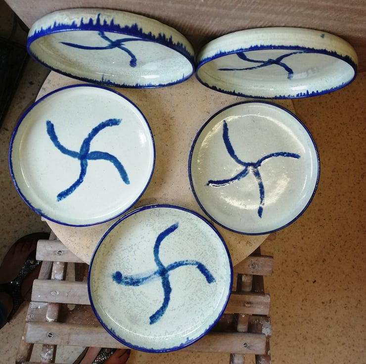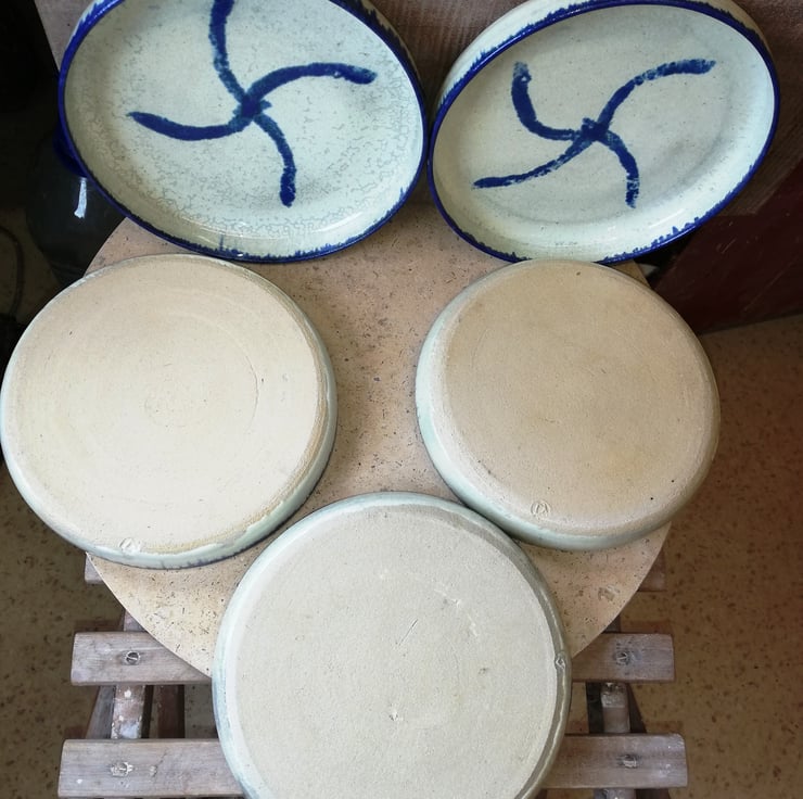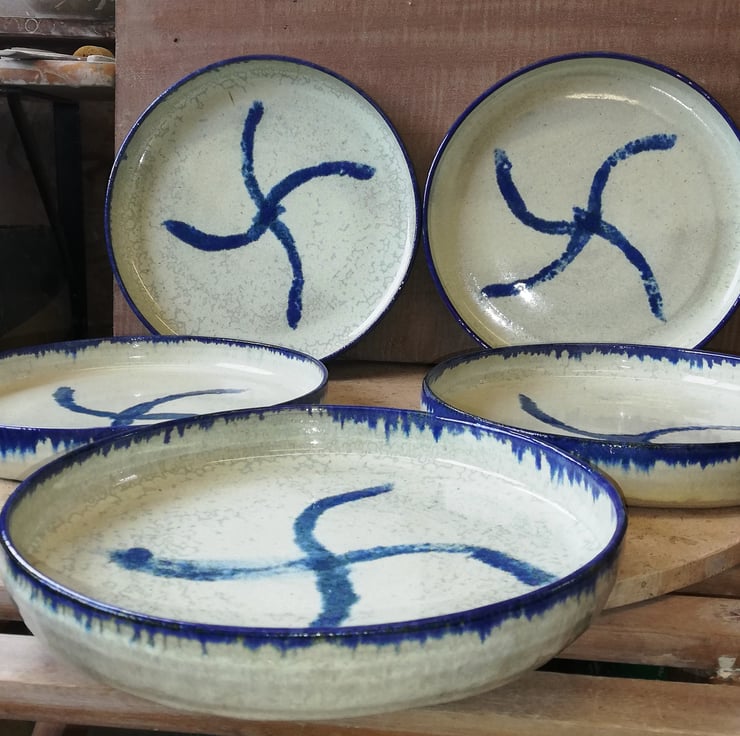 Eggshell white glossy glaze with blue decorated rim and center swirl stoneware bowl plates..