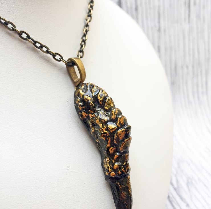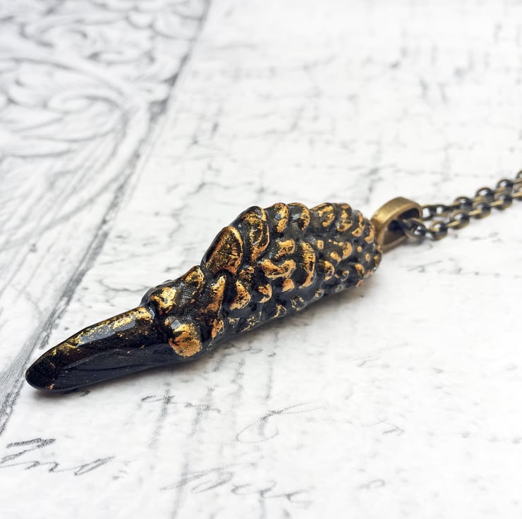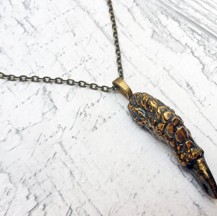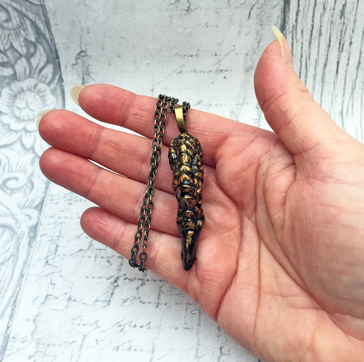 Once the embossing enamel is cooled in the mould, I added gold gilding wax to bring out the incredible detail of the scales and claw. I then coated the entire front with satin varnish and a very light coat of resin for extra durability. The reverse has a leaf shaped bail which I glued onto the back with professional jewellery glue and then added an antique bronze plated chain (nickel free) that is 18 inches or 45 cm in length, a 12mm lobster clasp and 4.3mm jump ring on the end. The links of the chain measures 4.5 x 3 mm and is known as a flat oval trace chain. This necklace is adjustable as the lobster clasp fits inside the links with ease! The dragon claw pendant itself measures approximately 5 cm long including the bail, by 1 cm wide and 1 cm deep.