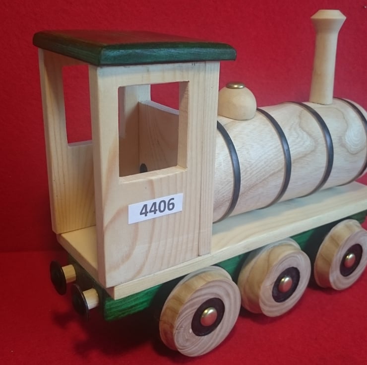 This magnificent large Train is a display toy anyone would be proud to show off - it weighs 750grms (nearly 2lbs) and measures 9" long x 7" tall - it is made of three different woods and apart from the base and Cab roof the rest is the natural wood with just a sealer.