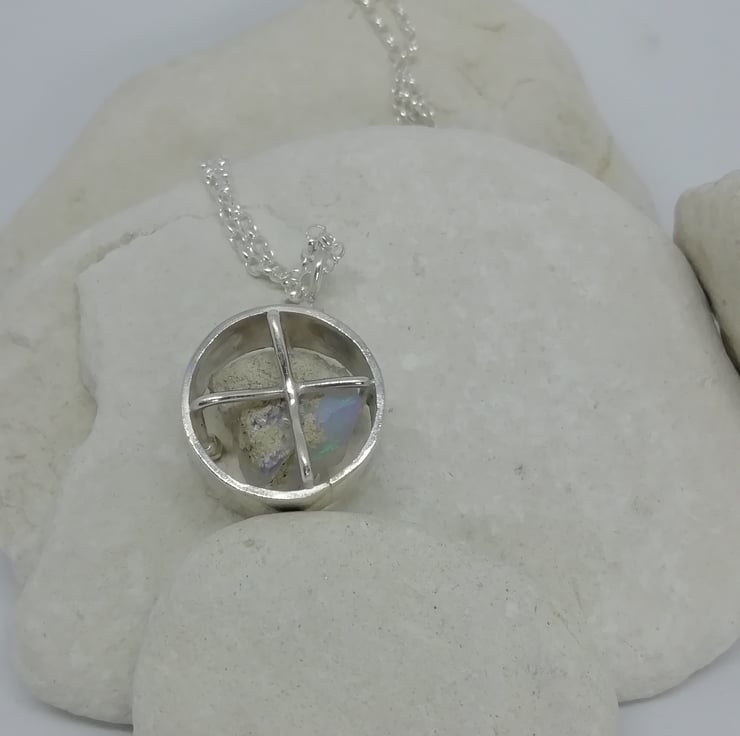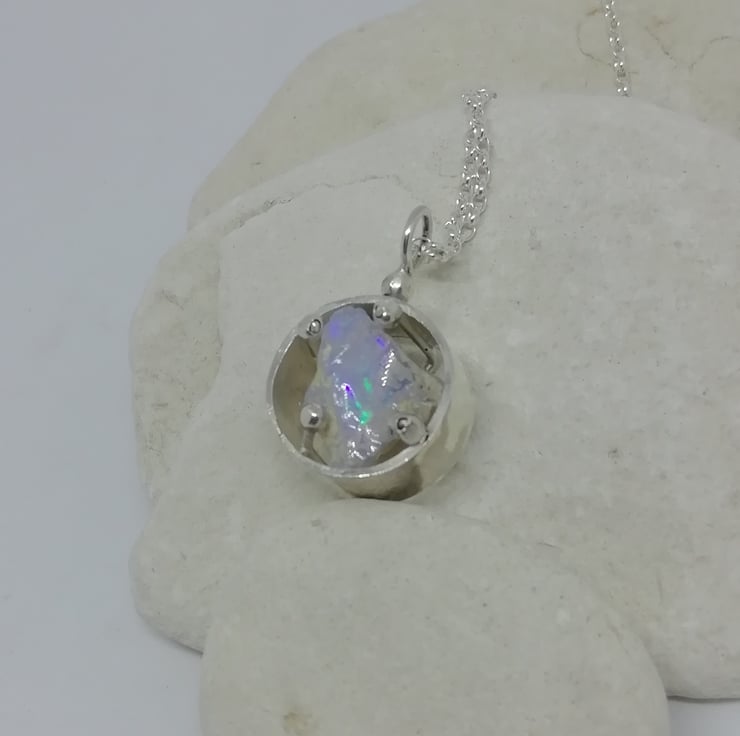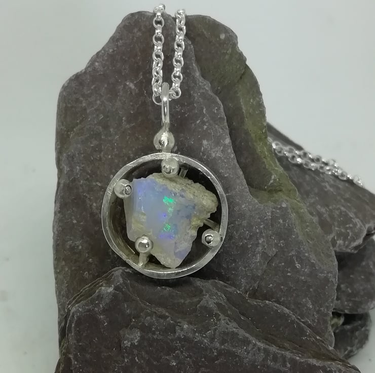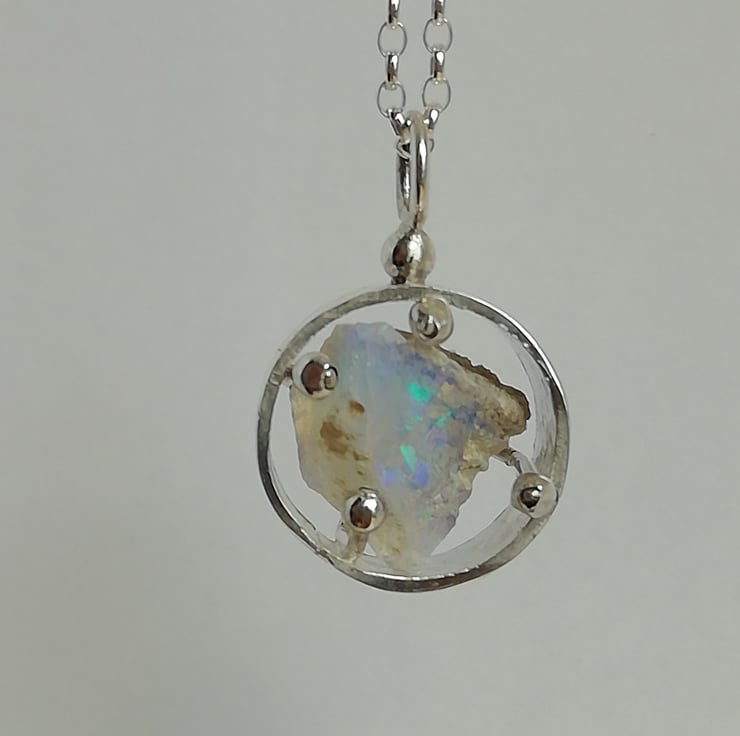 A pale blue raw opal, which flashes specks of electirc blue and green, is set in a 15 mm ring and held in place by clasps topped with a silver ball. The ring is 8 mm deep and is hung on a 40/45 cm silver belcher chain by a jump ring.